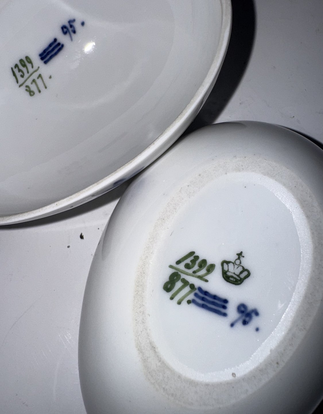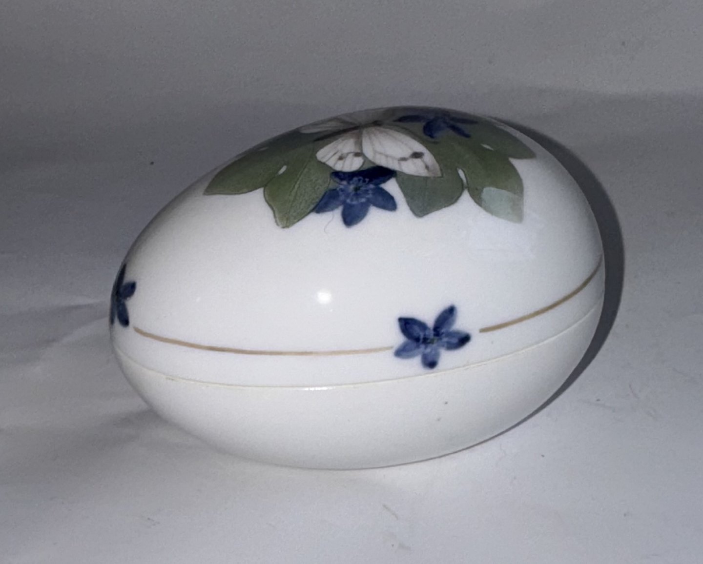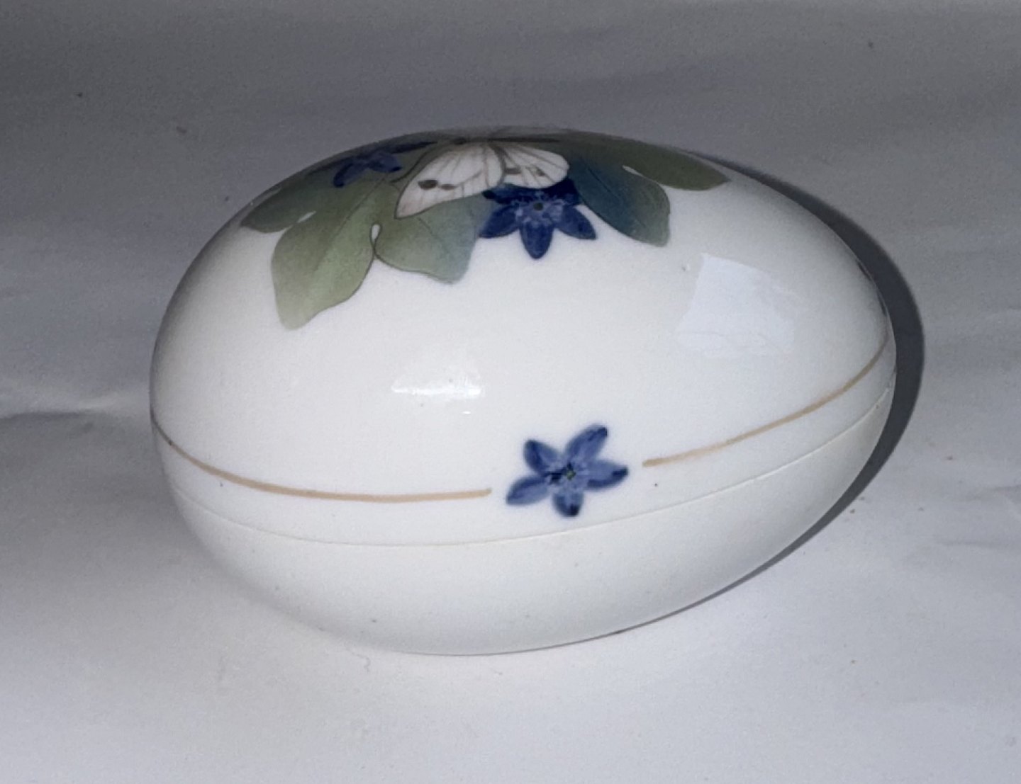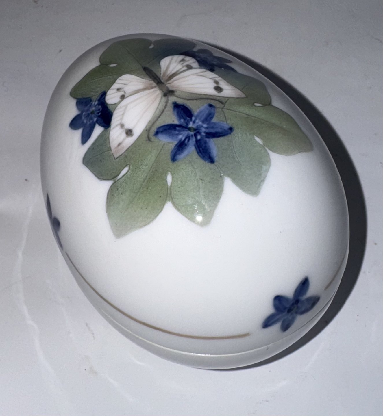 Two-part egg in porcelain, bottom and lid, from Royal Copenhagen. Decorated with a butterfly and flowers. Factory first quality. In good condition. Both parts factory marked with factory logo and model number 1399/877. Manufactured around 1920. Dimensions: H. 7.2 cm, W. 7 cm L. 10 cm. Dealer