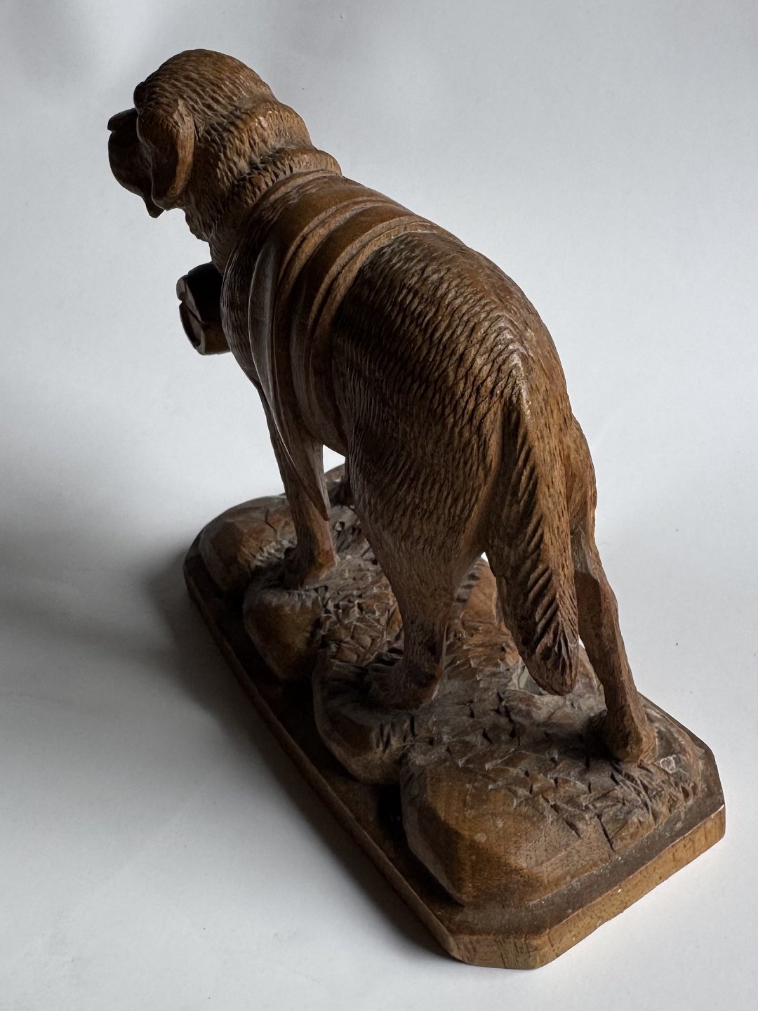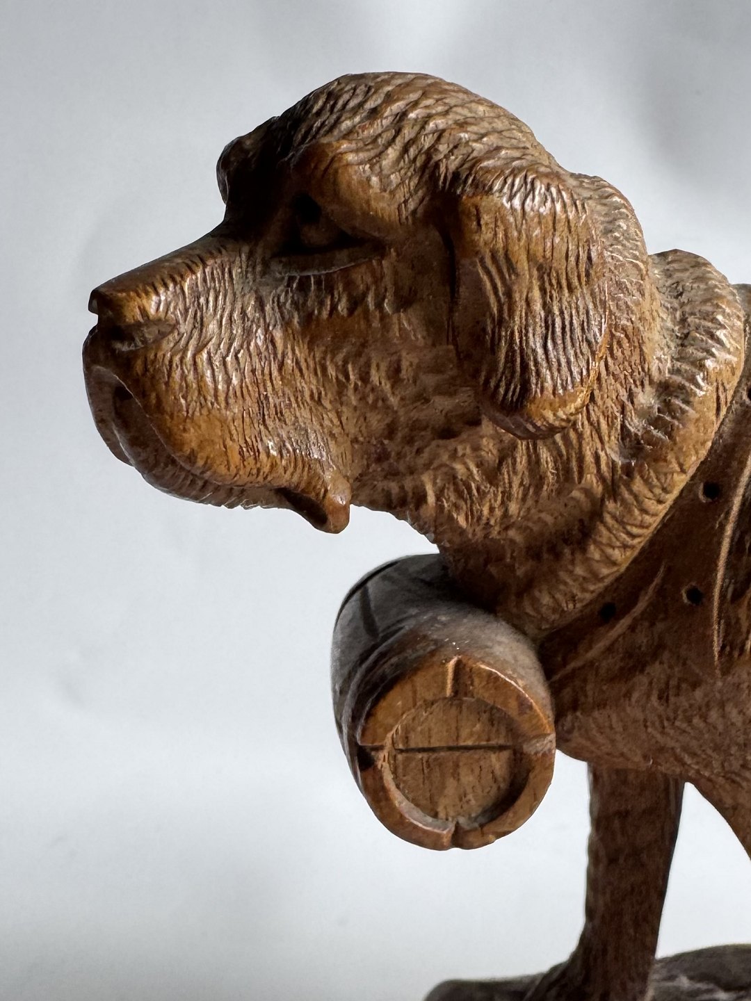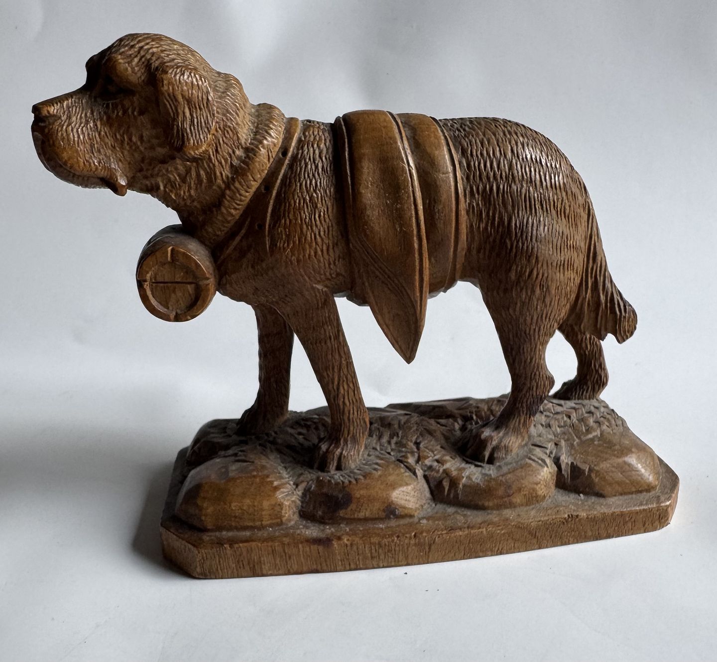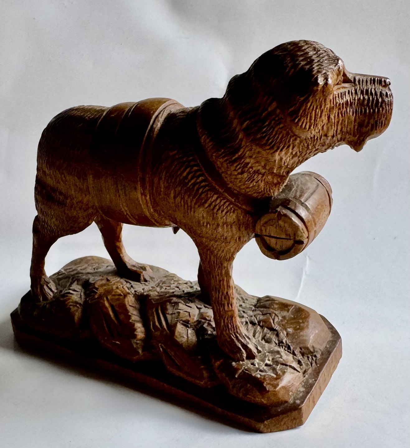 Carved figure in linden wood depicting a Saint Bernard dog with the eternal wooden barrel around its neck. Made in Switzerland in the early 20th century. Appears in good condition without damage or repairs. Dimensions: H. 12.5 cm. The base measures 6.2 x 13.4 cm. Dealer