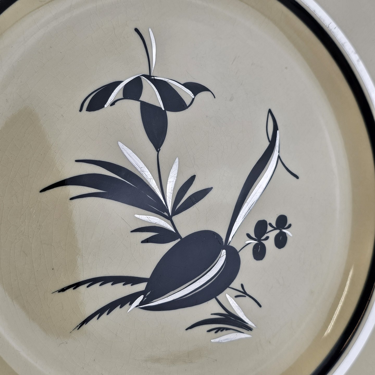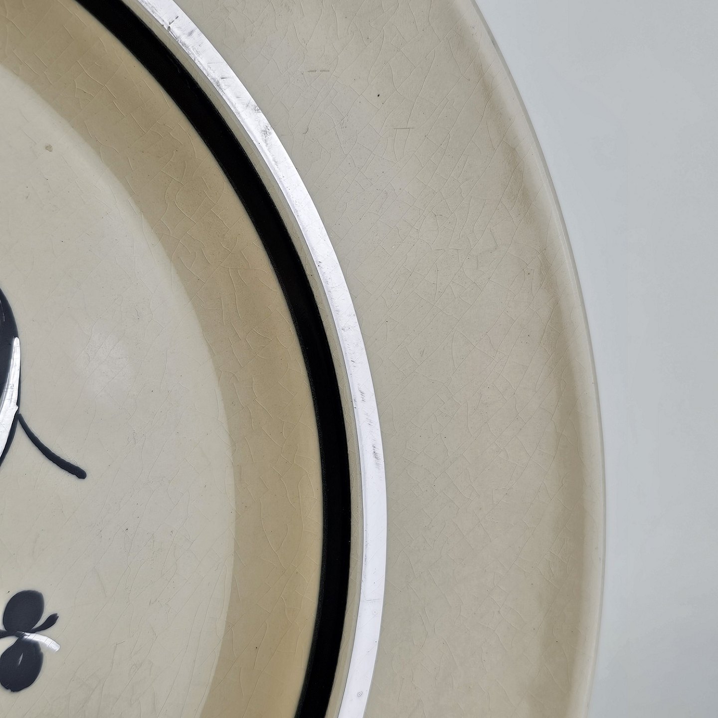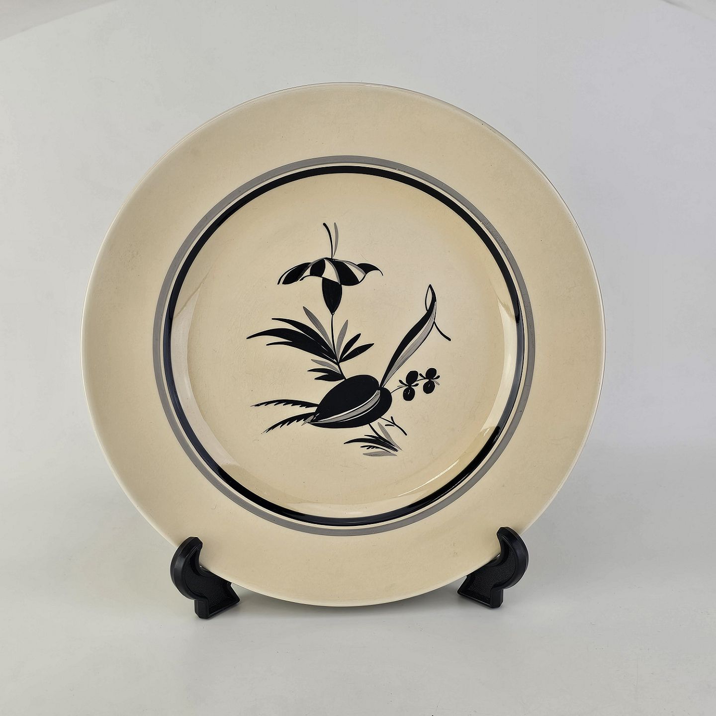 Råhvidt fajancestel i stelform E med dekoration af naturmotiver i sølv og sort farve.