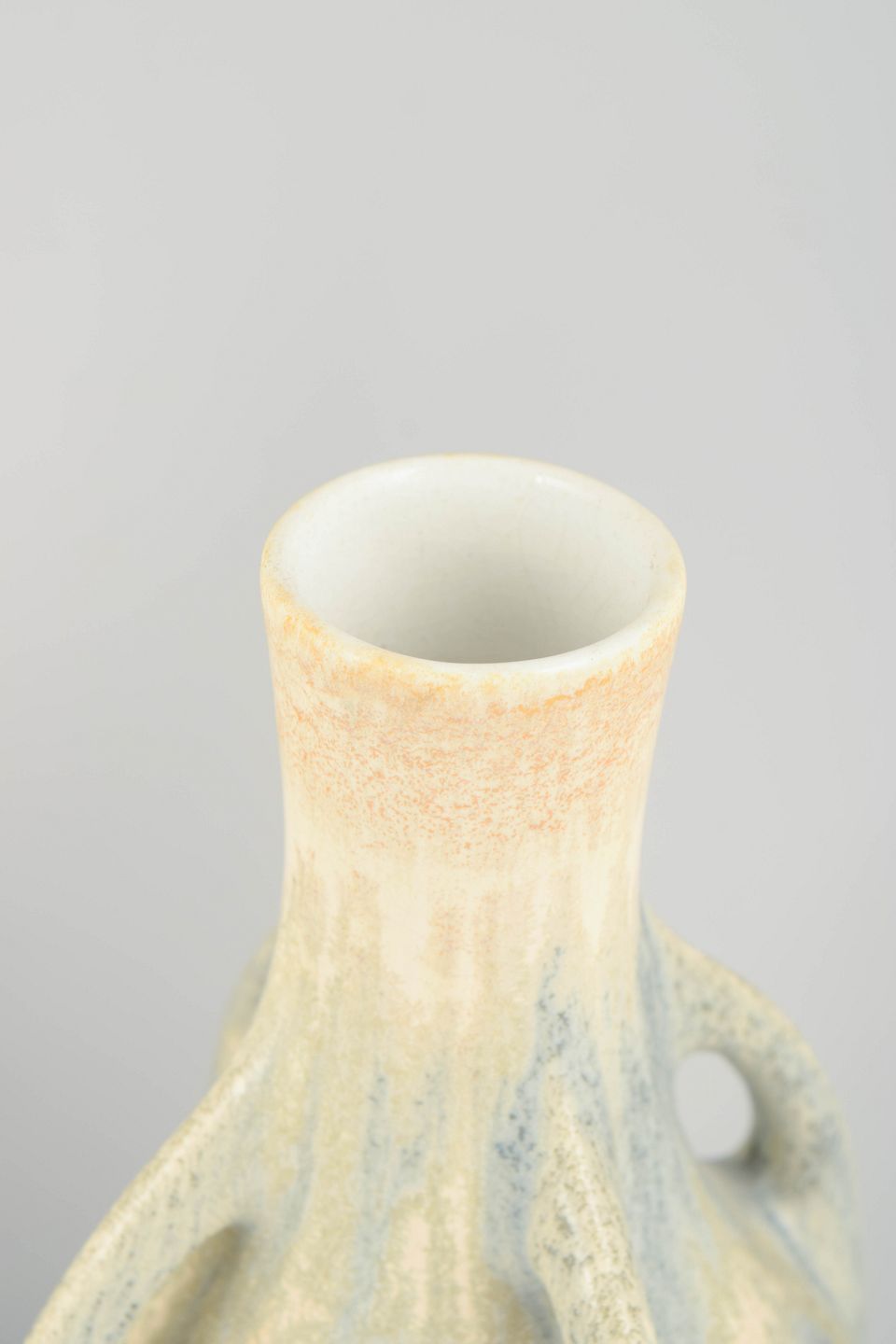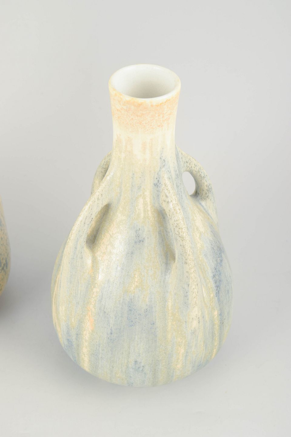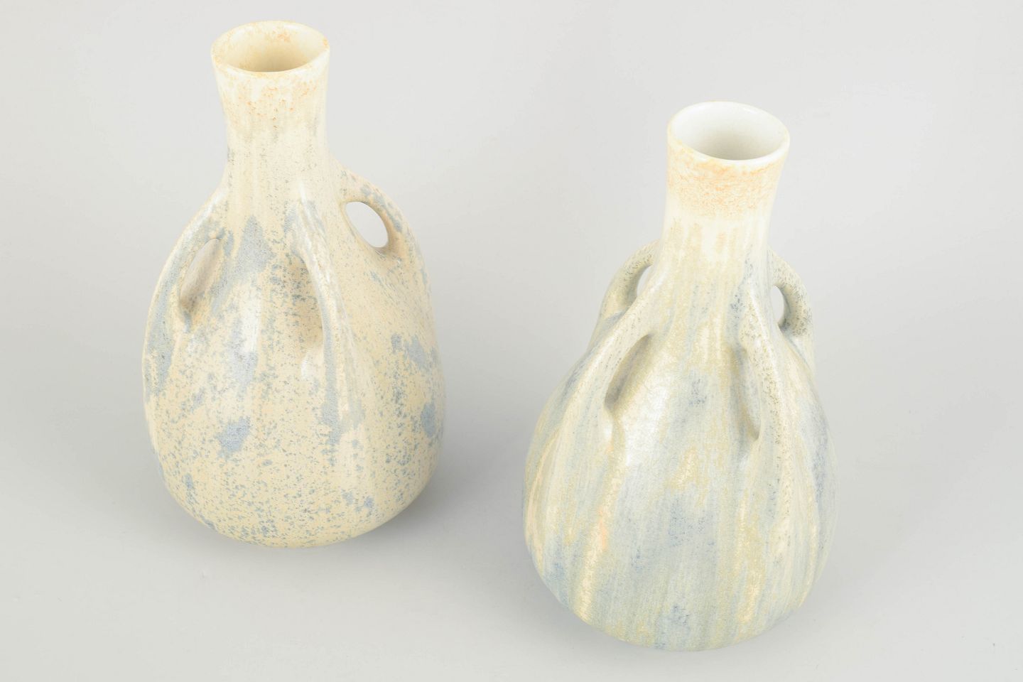 Rörstrand, pair of art nouveau faience vases.Two elegant art nouveau faience vases with baluster-shaped bodies and integrated handles at the neck. The glaze appears in soft, nuanced tones of ivory, pale blue and sand with a gently flowing effect, characteristic of early twentieth-century Swedish faience.
