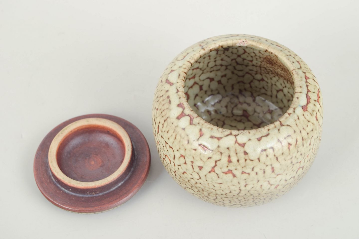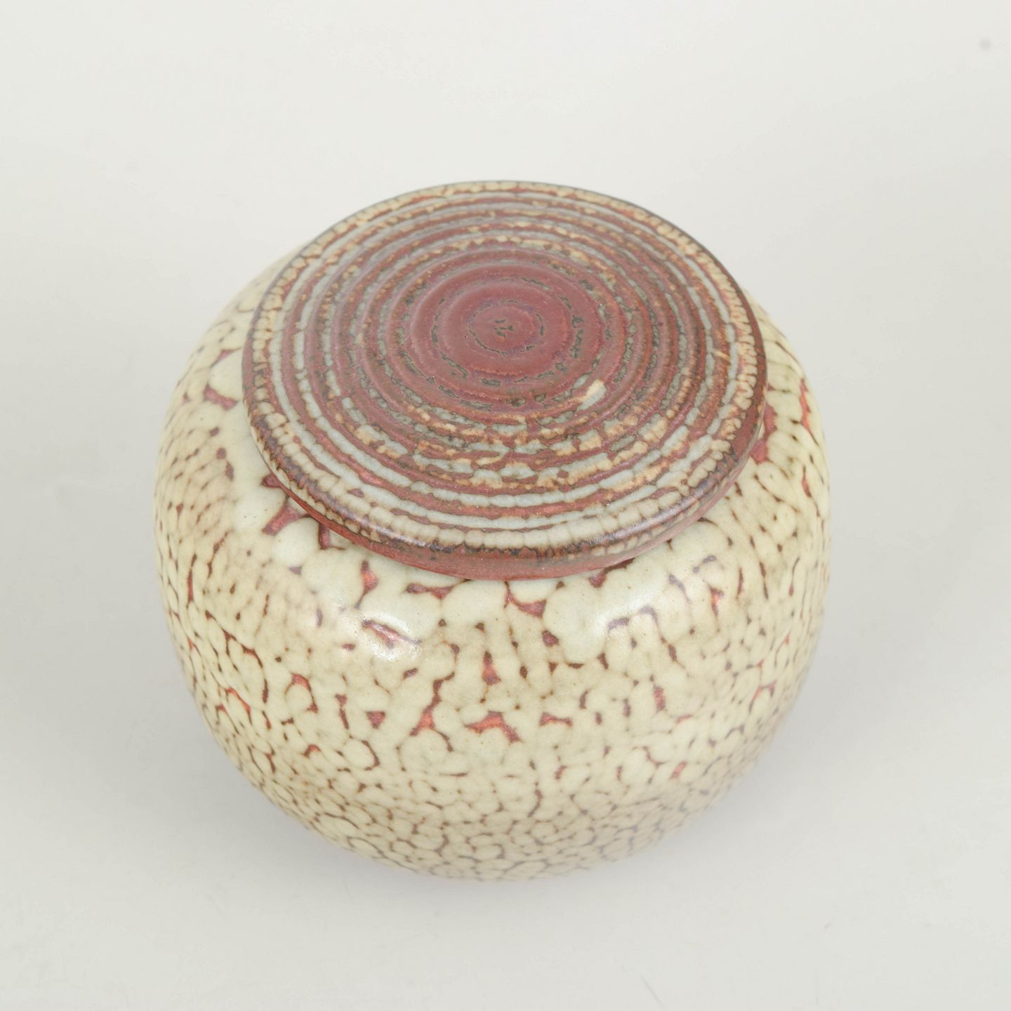 Saxbo, lidded jar.Early stoneware lidded jar with rounded body and flat lid. Glazed in a cream tone with fine crackle pattern and a warm reddish edge along lid and foot.