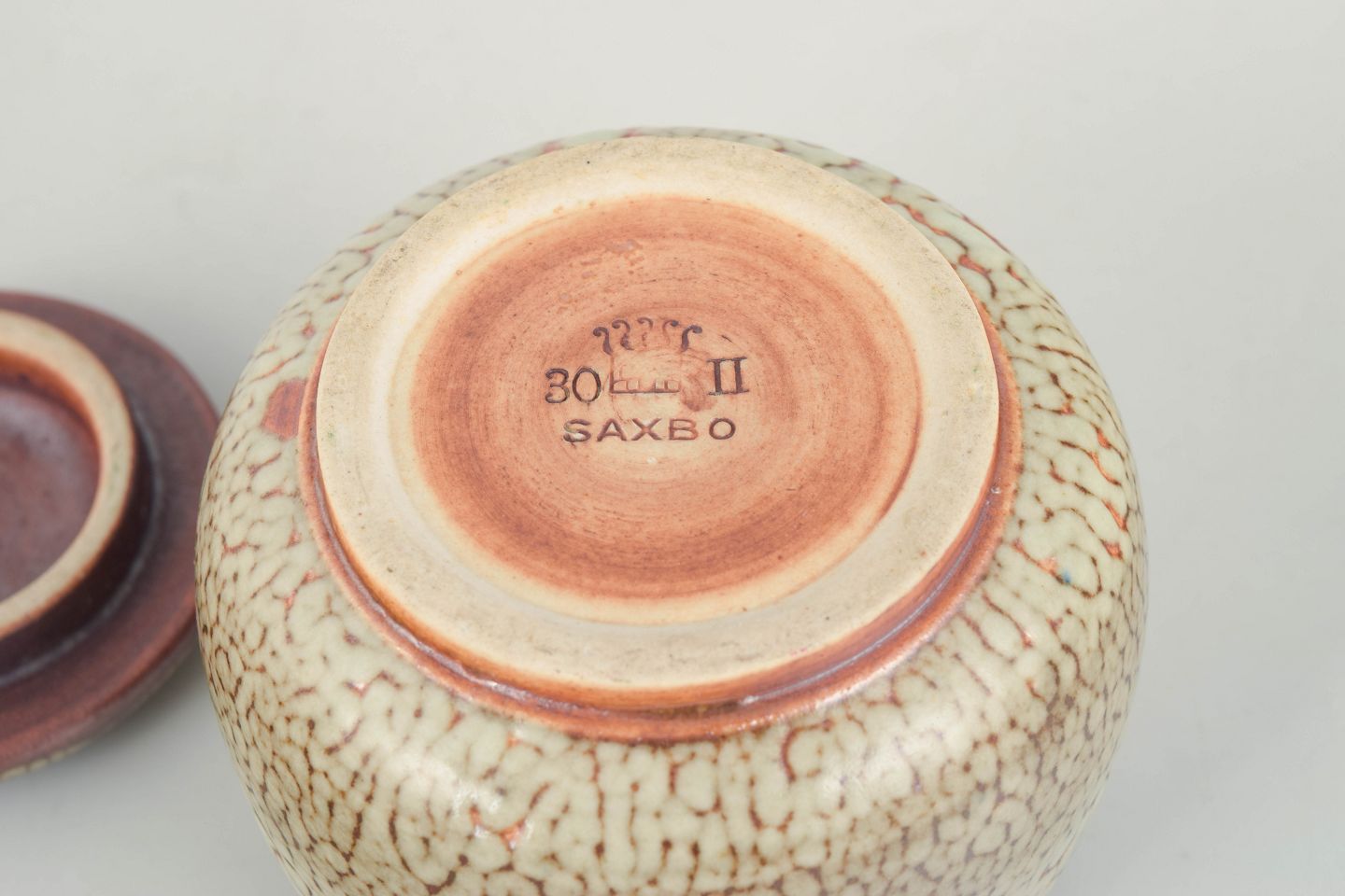 Saxbo Stoneware was founded in 1929 in Herlev, Denmark. The workshop became known for its restrained forms and experimental glazes with depth and subtle tonal variation. Production was characterised by high craftsmanship, and Saxbo is today regarded as one of the most significant Danish studio pottery workshops of the twentieth century.