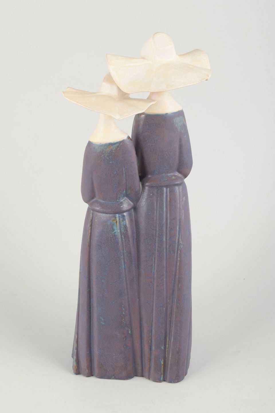Monumental ceramic sculpture from the 1980s, executed in porcelain with characteristic soft modelling and subdued glazes in violet and cream tones. The composition depicts two stylised female figures with wide hats and elegant vertical drapery lines. Marked on the underside Lladró, Hand Made in Spain, Daisa.