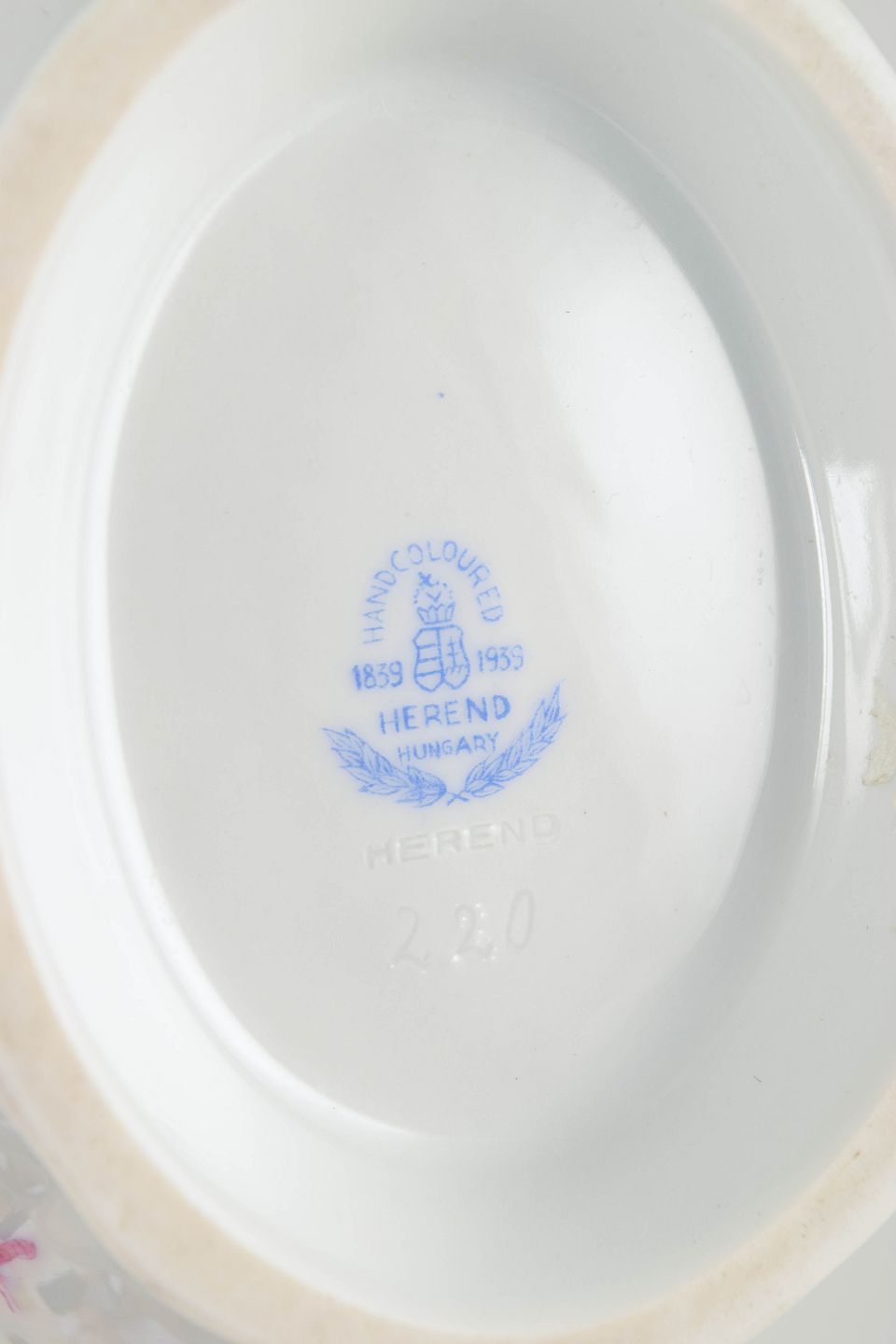 Herend Porcelain Manufactory was founded in 1826 in Herend, Hungary. The factory gained international recognition at the Great Exhibition in London in 1851 and soon became a supplier to European royal courts and aristocracy. The Apponyi pattern was developed in the late 19th century and named after the Hungarian Apponyi family. The design is characterised by stylised floral bouquets and exists in several colour variations, including the pink version.