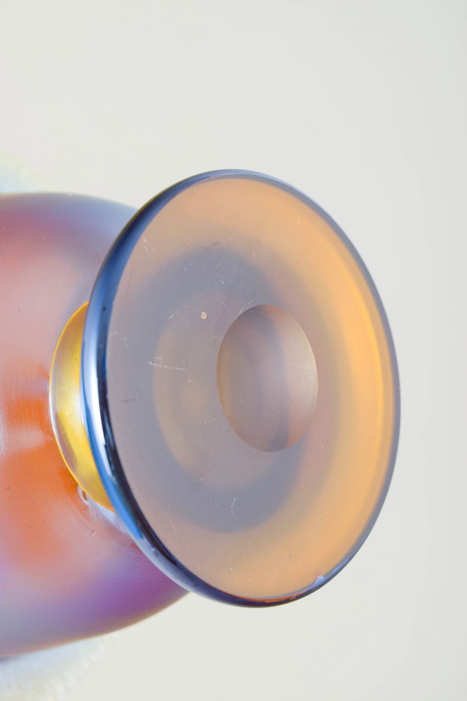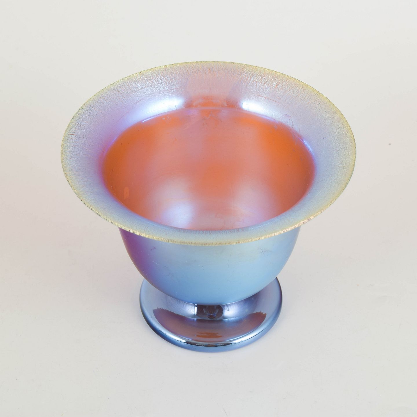 Loetz iridescent glass vase.Bowl-shaped vase in mouth-blown glass with a wide, slightly flaring rim and short foot. The surface features a silky matte iridescent finish in blue and violet tones with a warm coppery glow inside. The simple, classical form combined with the vibrant colour play is characteristic of Loetz production in the 1920s, when harmonious proportions and metallic sheen were key aesthetic elements.