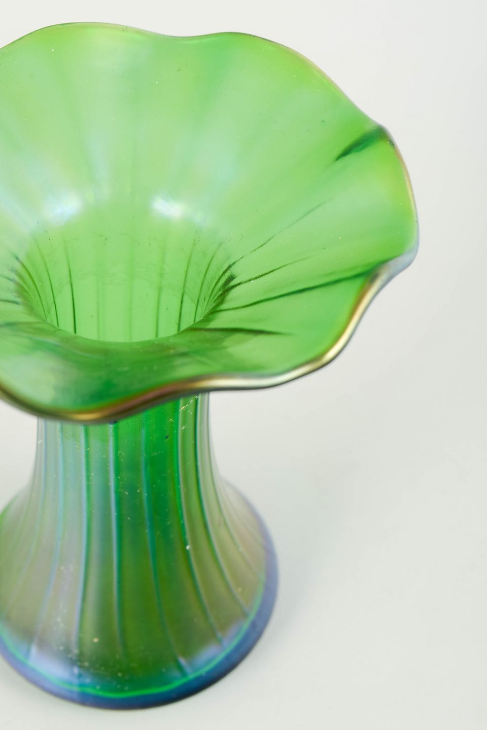 Elegant vase in mouth-blown glass with a wavy flaring rim and a slender, curving body. The surface displays a strong iridescent effect in vivid green tones with bluish nuances at the base. The scalloped rim and vibrant colour play are characteristic of Loetz production in the 1920s, when decorative silhouettes and metallic sheen remained central to the glassworks’ aesthetic.