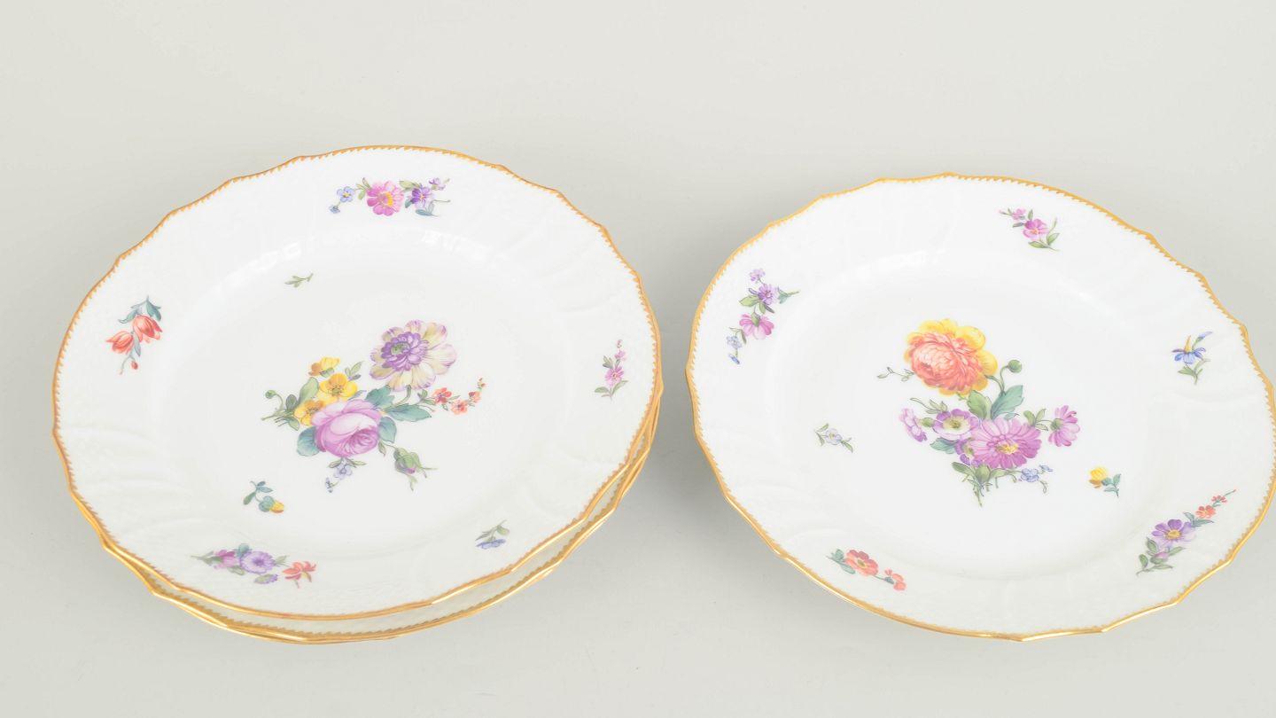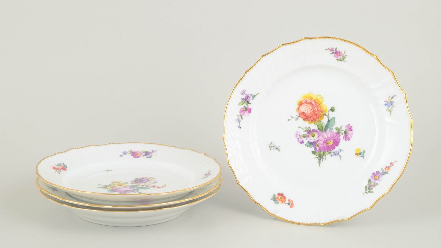 Royal Copenhagen, Saxon Flower set of four lunch plates.Hand-painted porcelain decorated in the Saxon Flower pattern, model 4/1623. First factory quality.