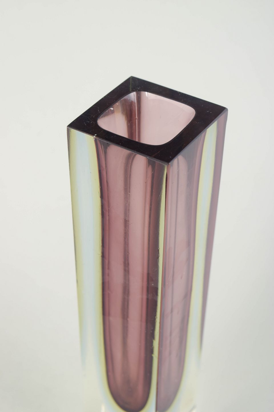 Tall rectangular vase in clear and pink glass with an encased coloured core and faceted sides.