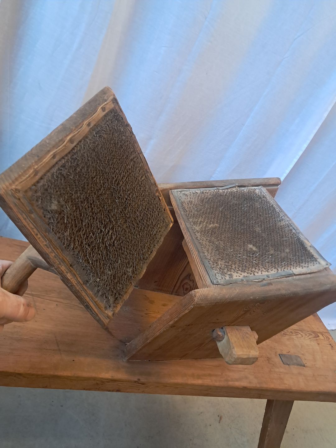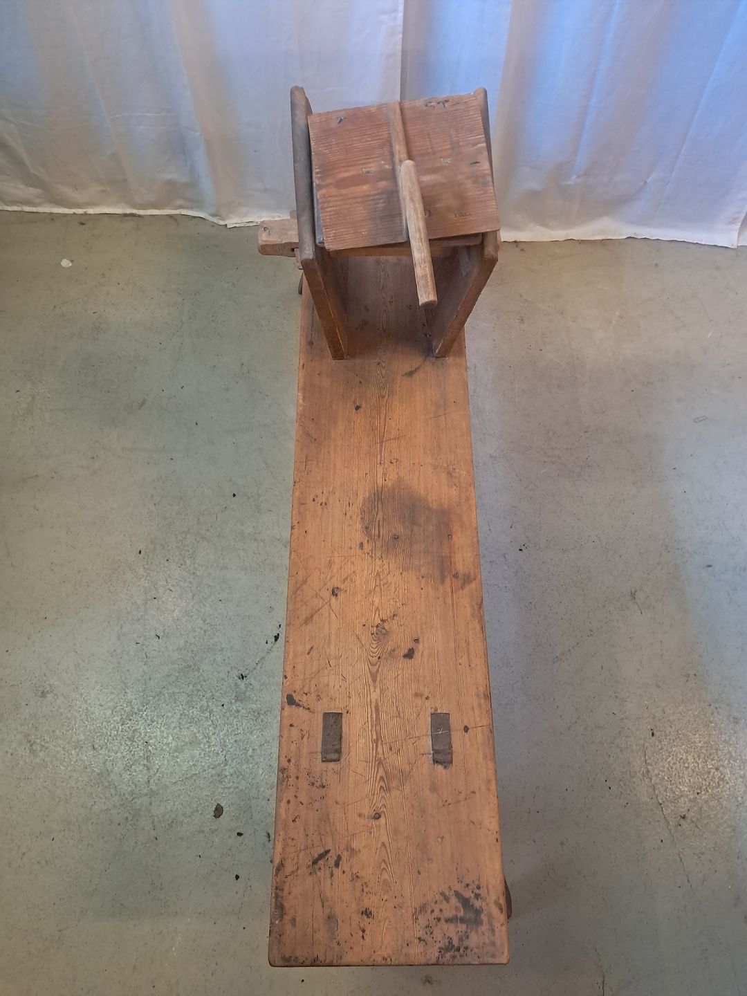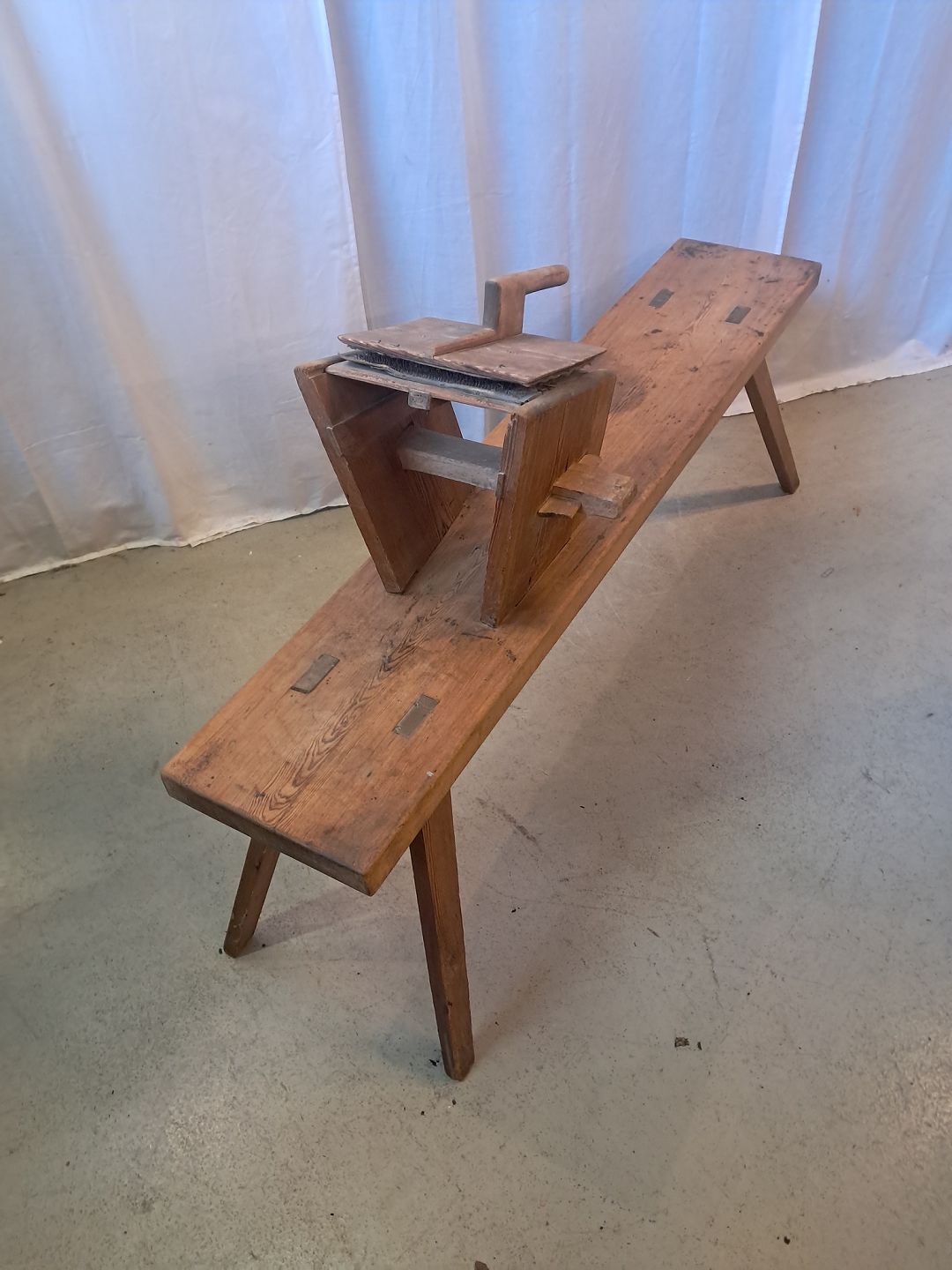 Bænk til uldkarding i massivt fyrretræ, fra 1910erne.Den har patina.