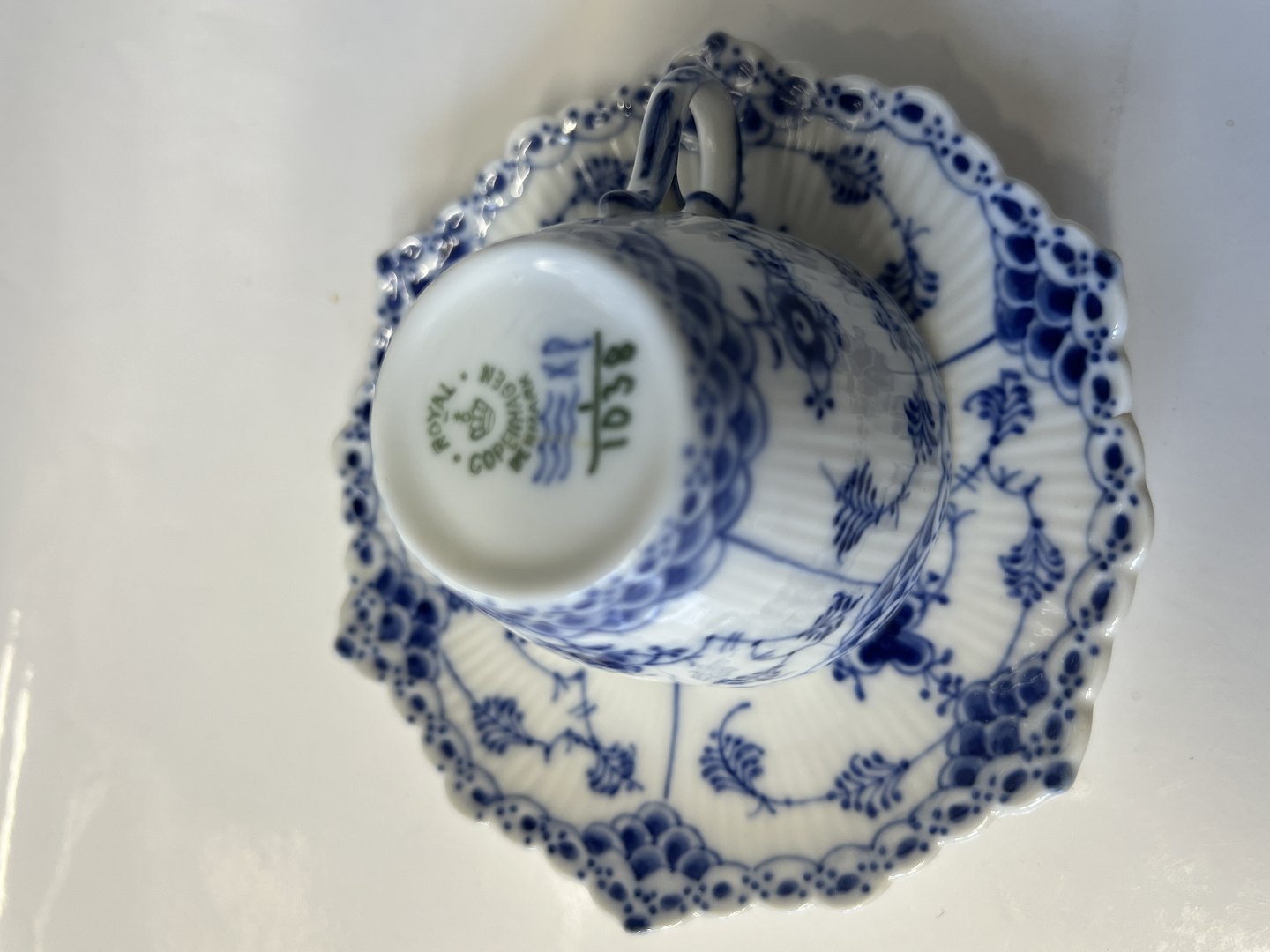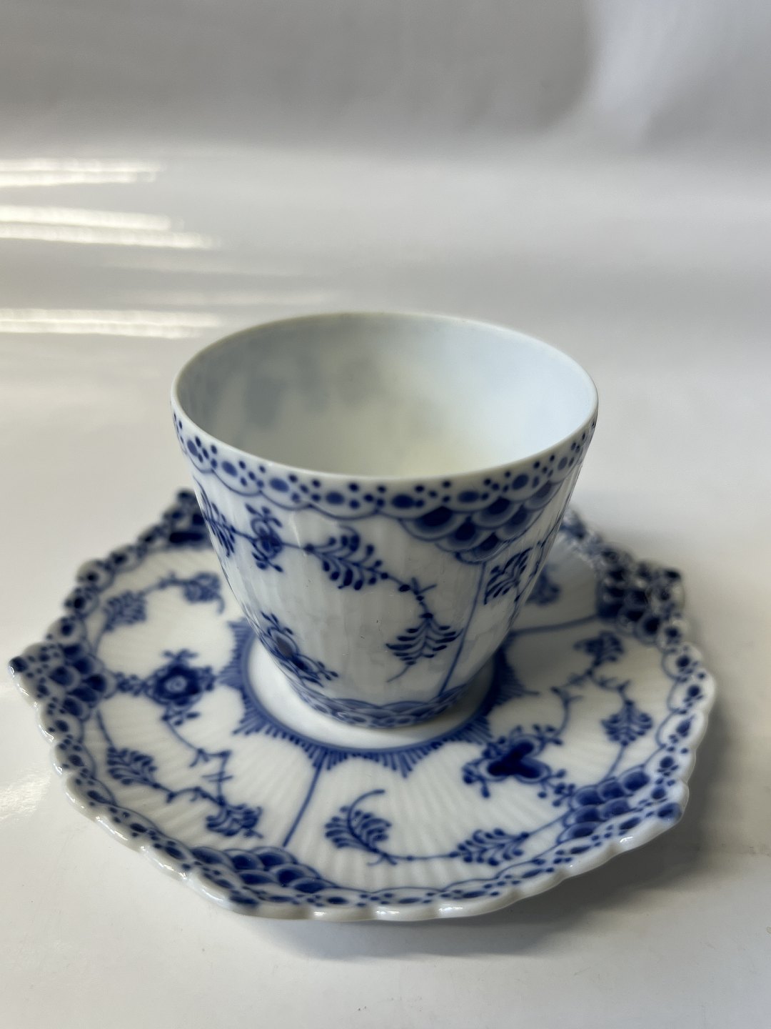 Royal Copenhagen Blue Fluted Lace, small espresso cup with accompanying saucer.Decoration number 1/1038.