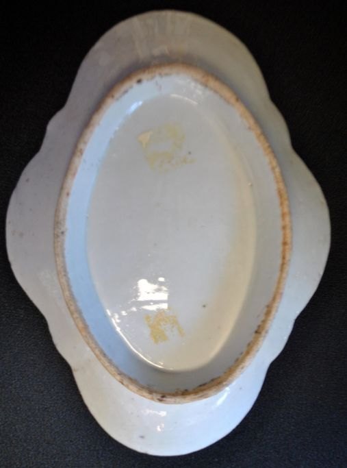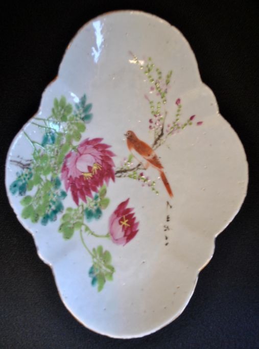 Chinese porcelain bowl, 19th century. Hand-painted with flowers and birds. 8-sided. L.: 27.5 cm. W.: 20 cm.