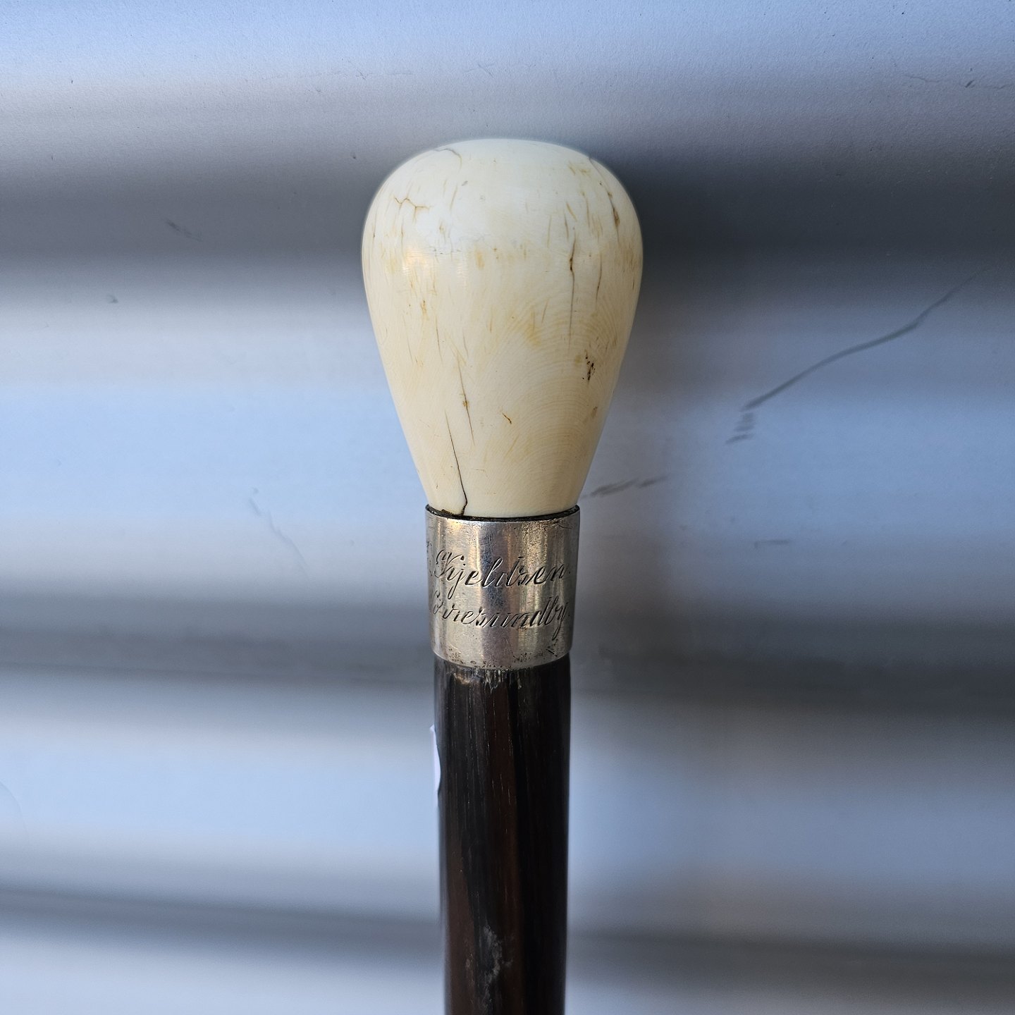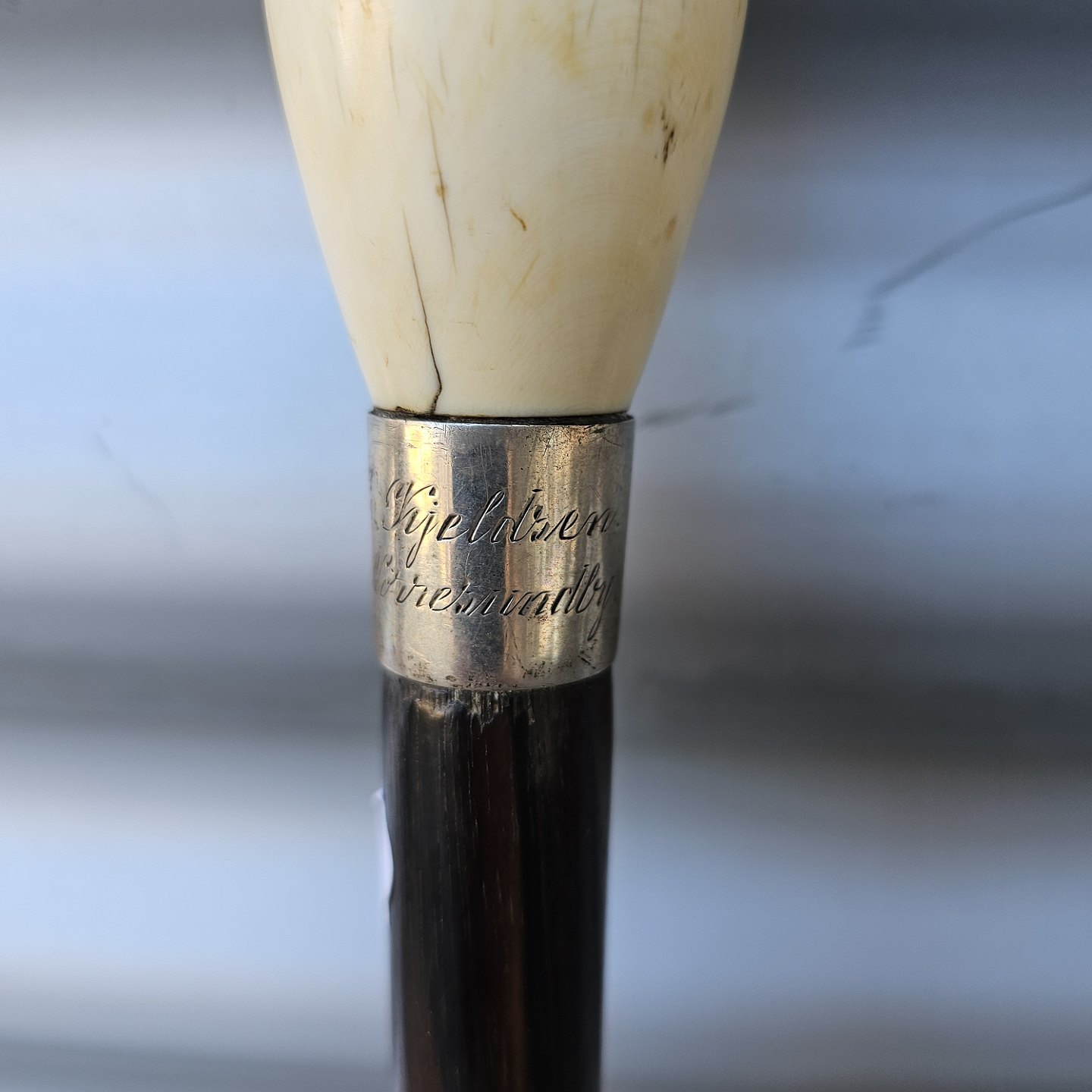 Stok i palisander med knop af ben og sølv, 828SIndgraveret E. Kjeldsen Nørresundby
