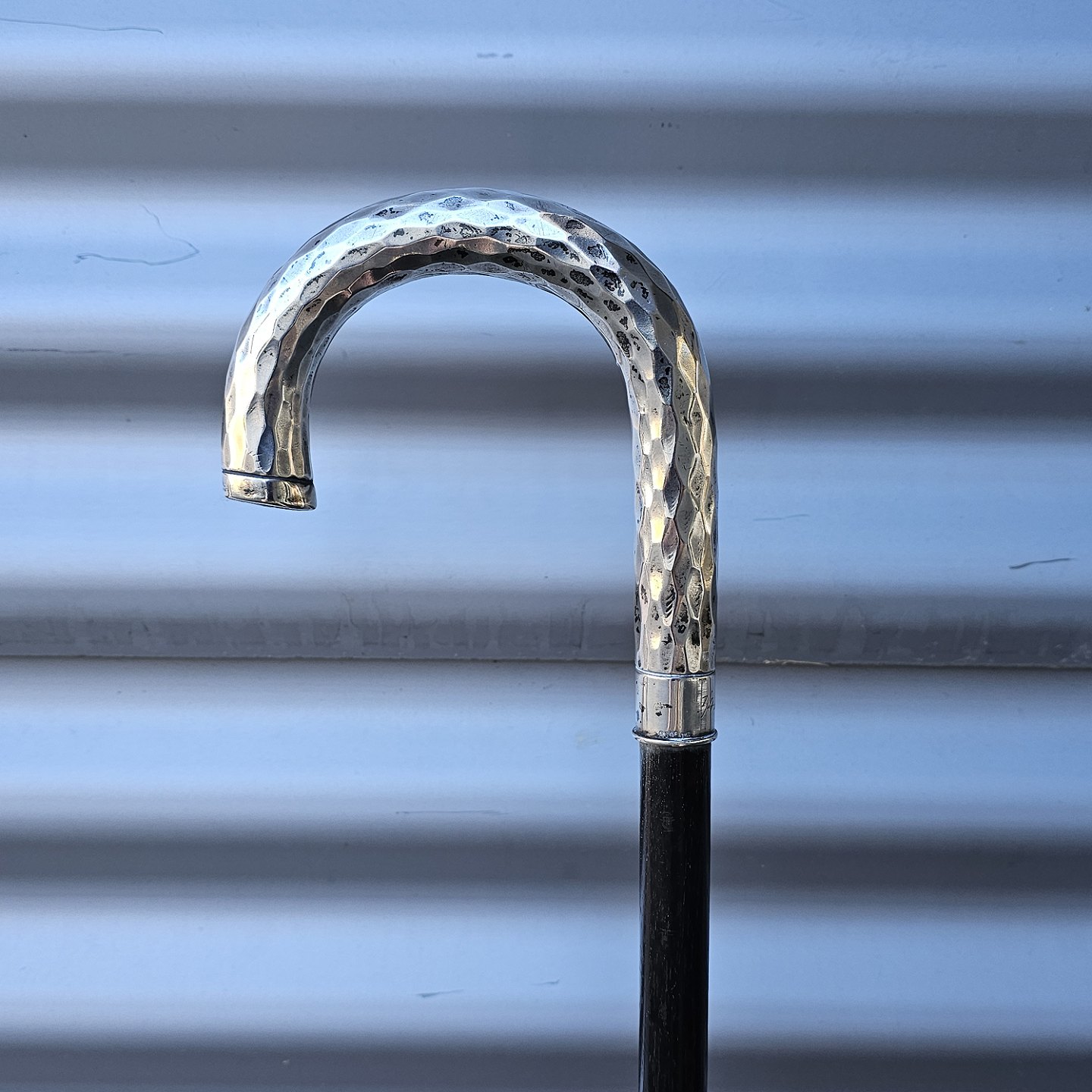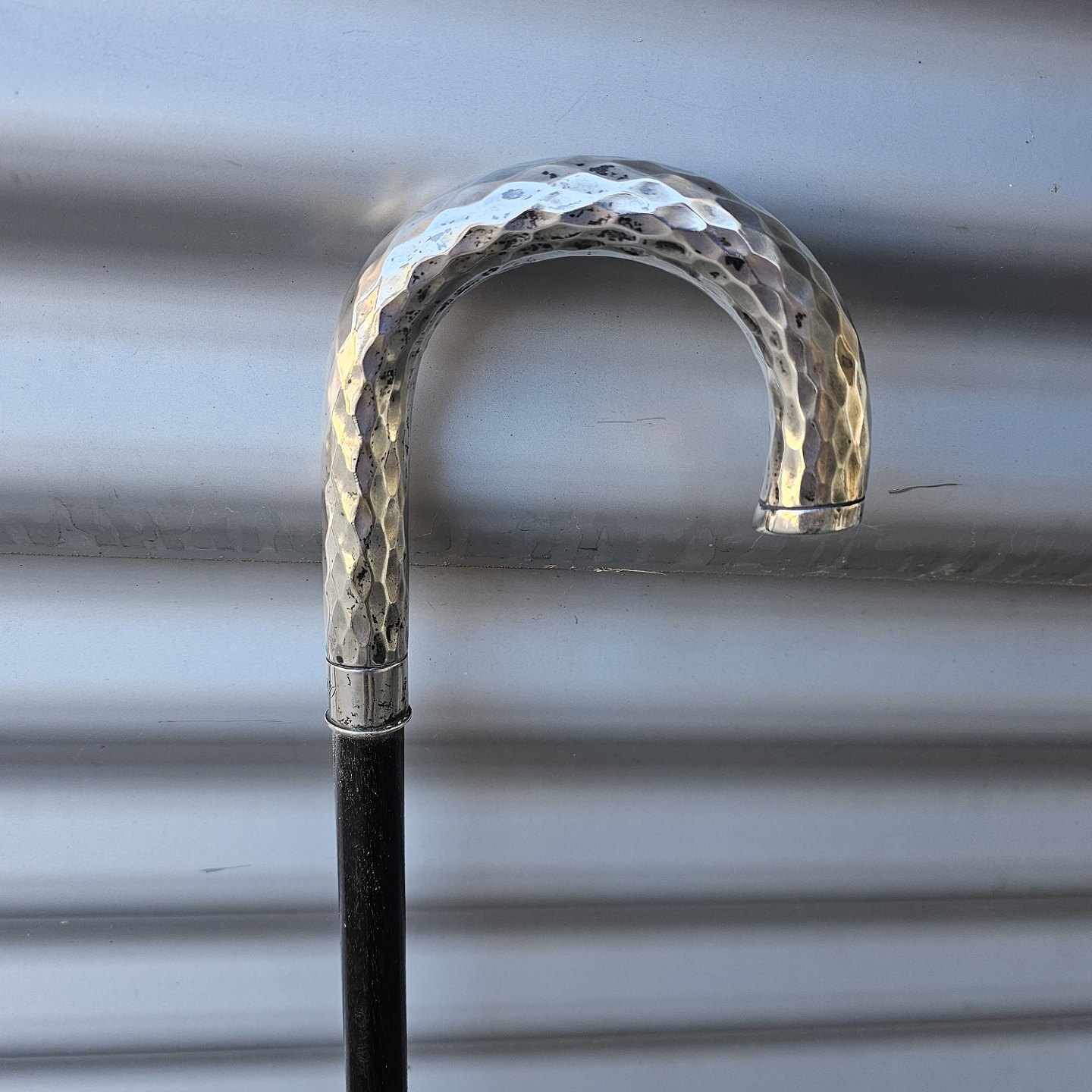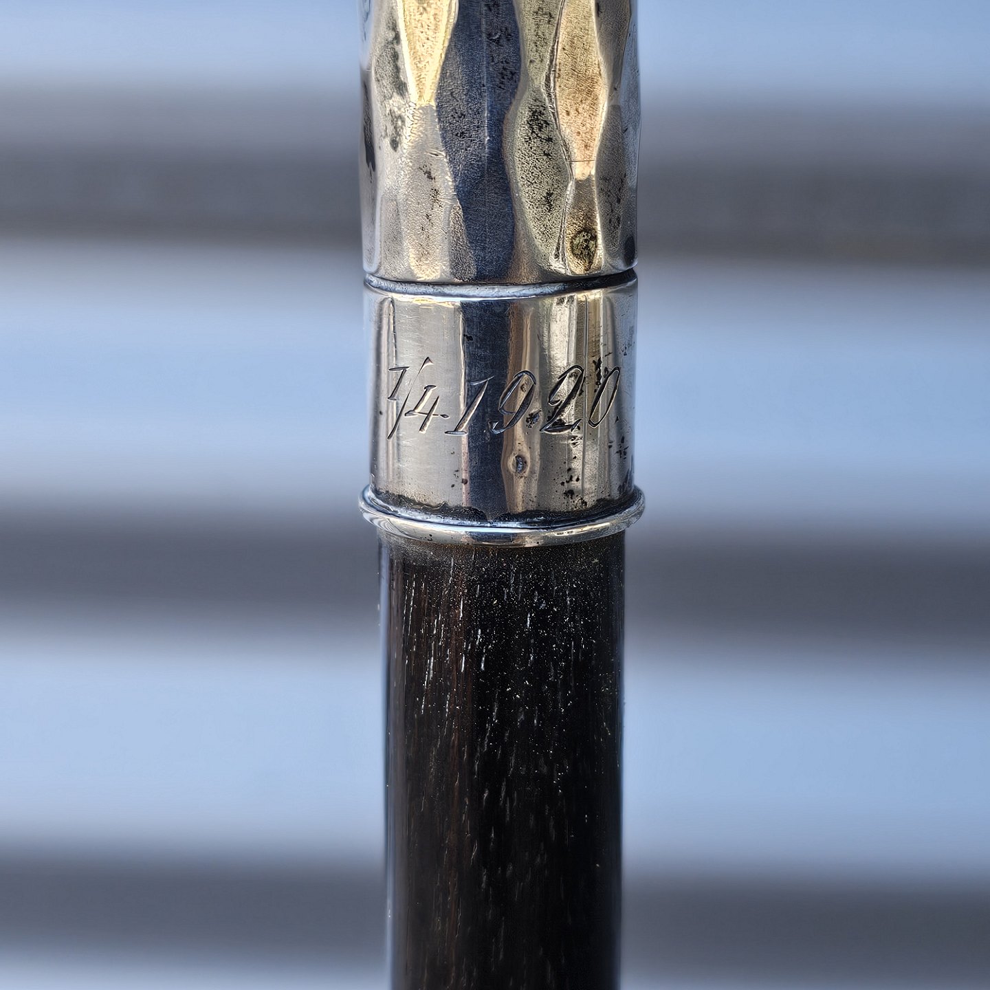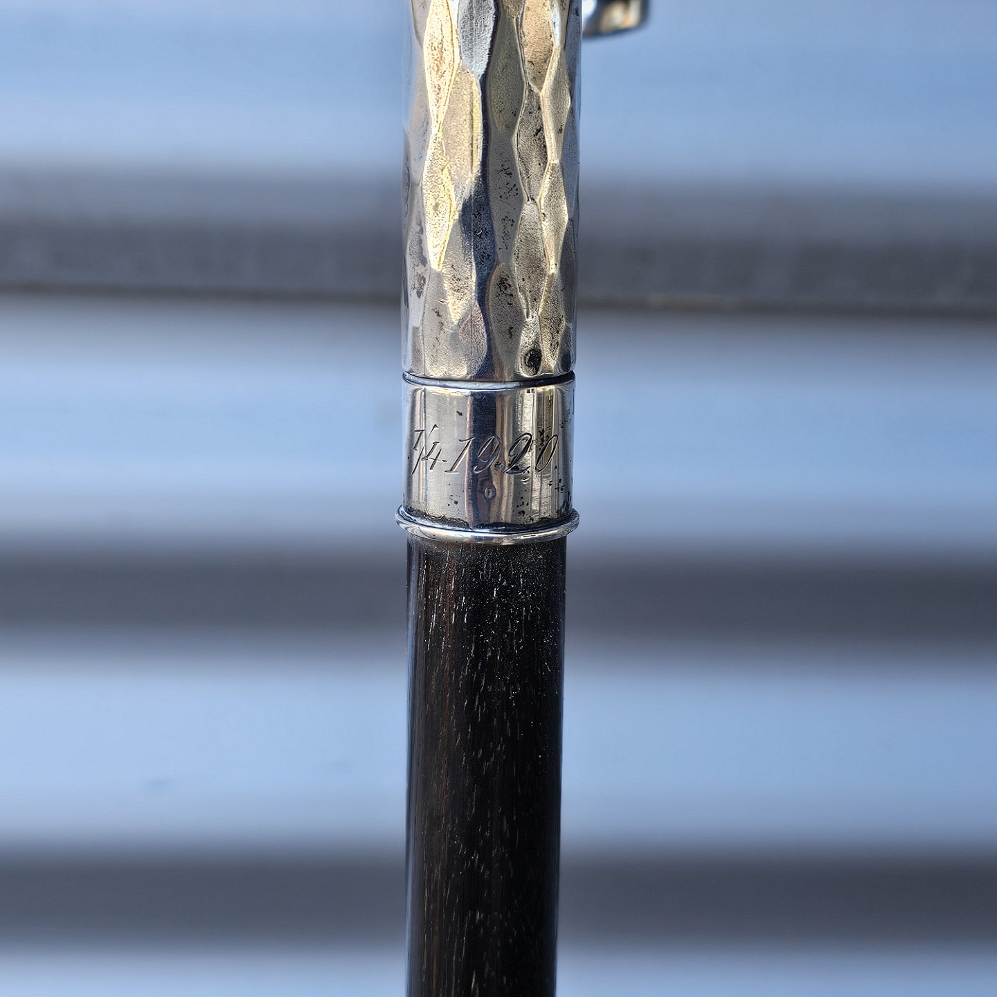 Stok i træ med buet håndtag i sølv, 830SIndgraveret EW 1/4-1920