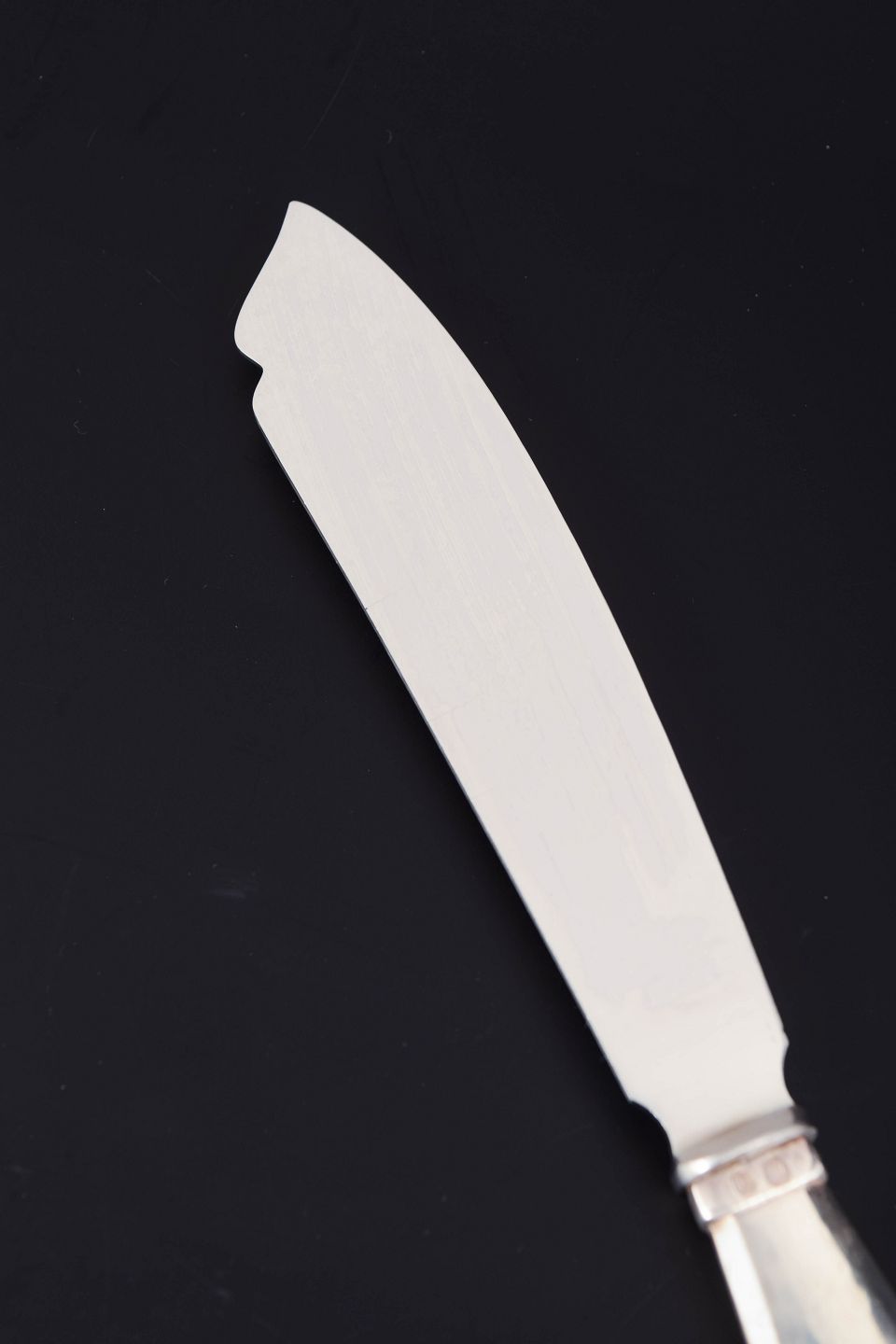 Rare cake knife in stainless steel and 830 silver with handle in the Viking pattern. The knife features a characteristic broad blade with a small notch near the tip and an elegant silver handle with softly rounded forms and decorative border typical of Georg Jensen’s early twentieth-century flatware designs. Marked with the Danish three-tower silver hallmark.