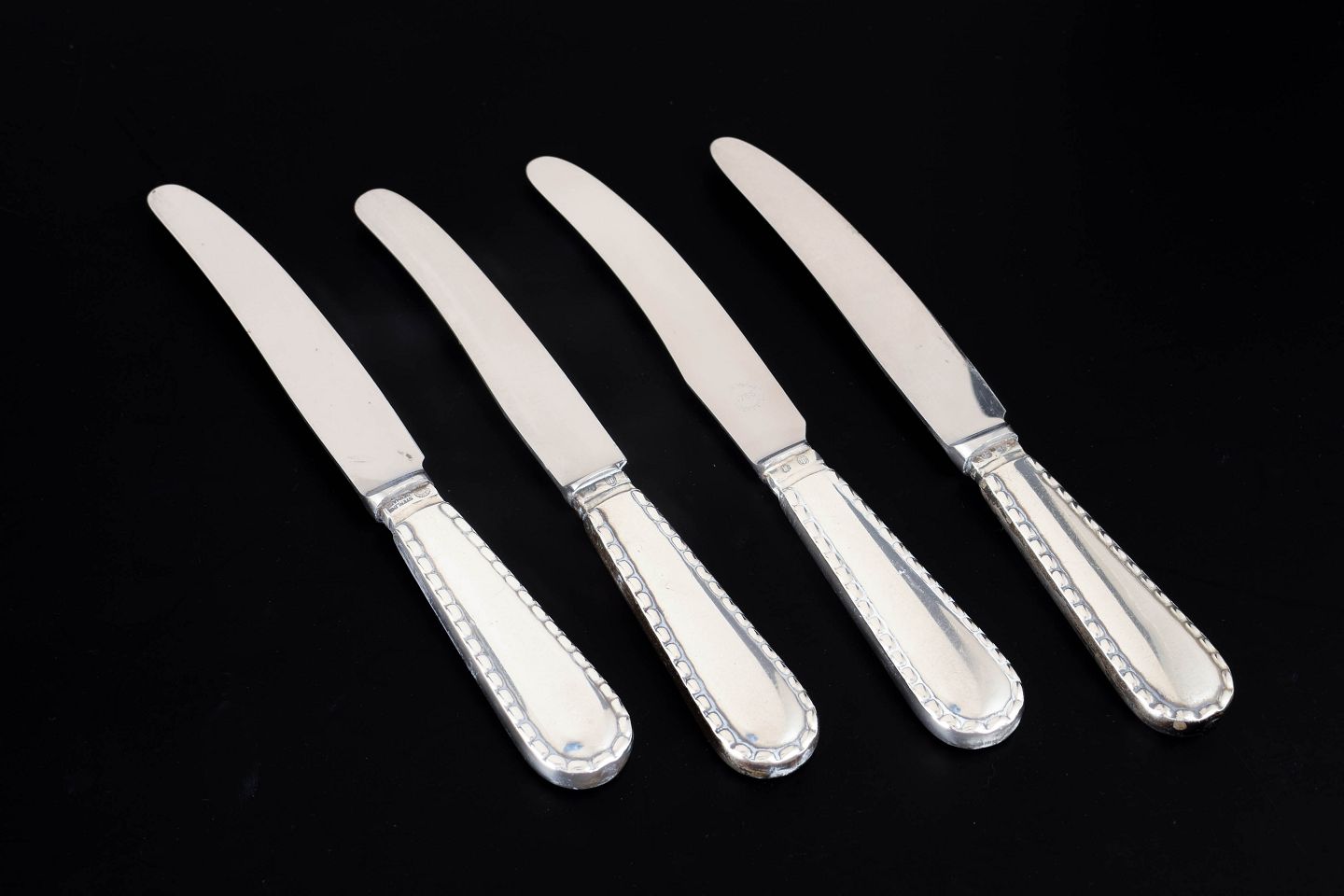 Set of four knives in stainless steel and 830 silver in the Beaded pattern from Georg Jensen. The handles are decorated with a characteristic beaded border along the edge, a classic ornamental detail that gives the flatware an elegant and timeless appearance.