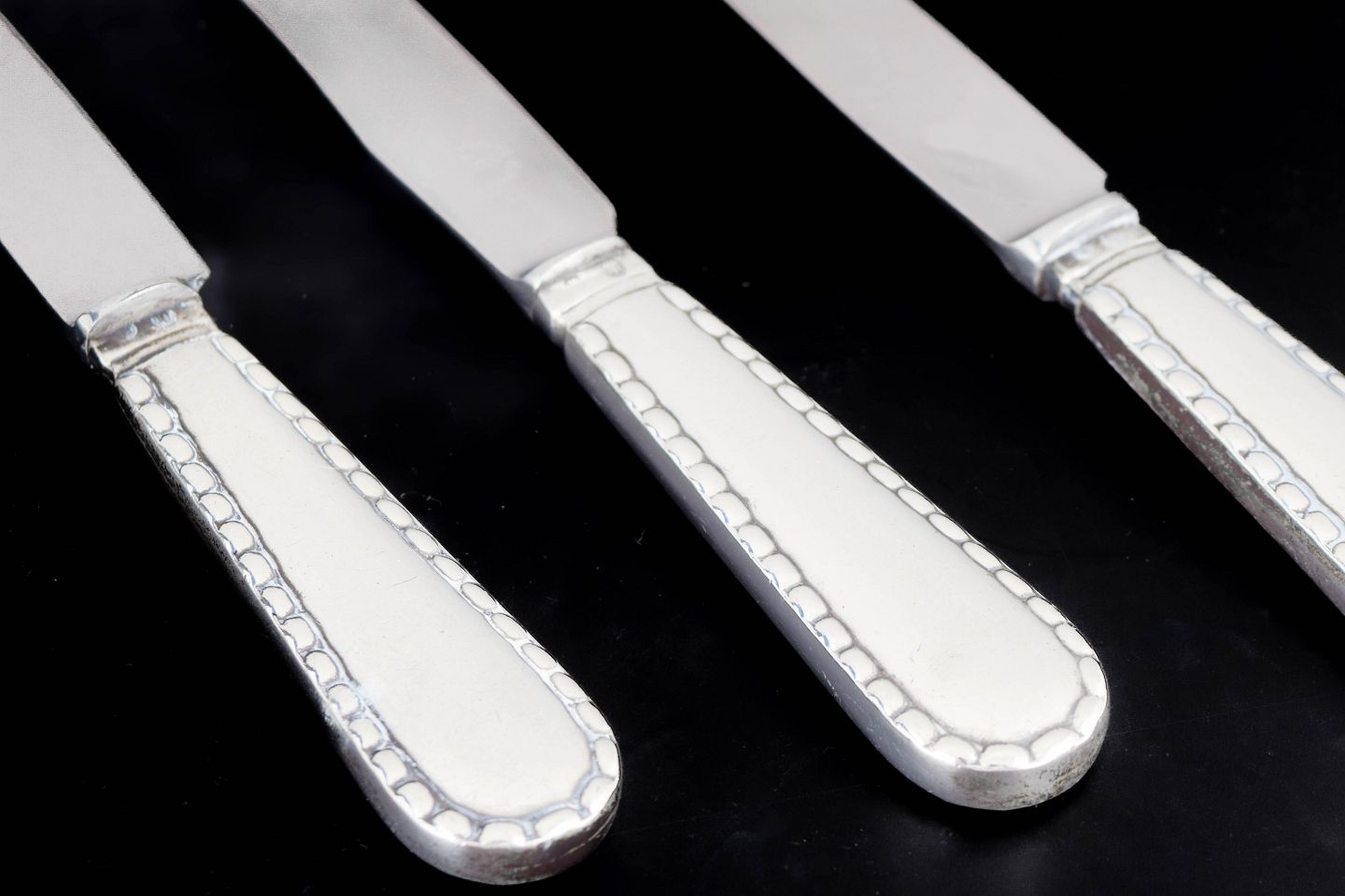 Georg Jensen, set of three knives Beaded.Set of three knives in stainless steel and 830 silver in the Beaded pattern from Georg Jensen. The handles are decorated with a characteristic beaded border along the edge, a classic ornamental detail that gives the flatware an elegant and timeless appearance.