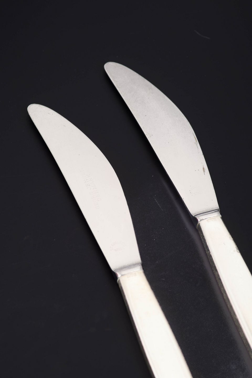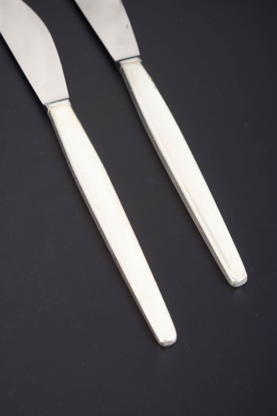 Georg Jensen, two lunch knives, Cypress.Two lunch knives in stainless steel and sterling silver in the Cypress model from Georg Jensen. The design features a slender tapered form and smooth modern lines characteristic of Georg Jensen flatware from the post-war period.