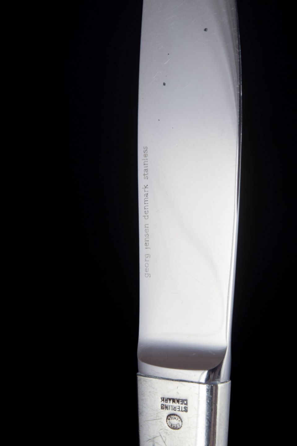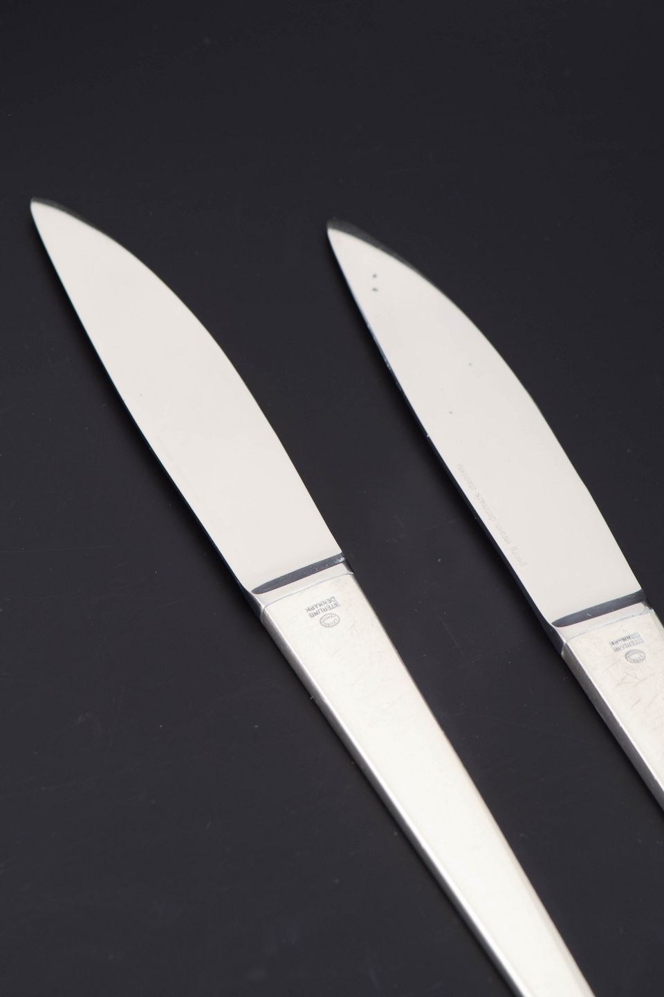 Henning Koppel for Georg Jensen, two small lunch knives Caravel.Two lunch knives in stainless steel and sterling silver in the Caravel model designed by Henning Koppel for Georg Jensen. The design features clean modern lines and a slender tapered form characteristic of Koppel’s functionalist approach to silverware design.