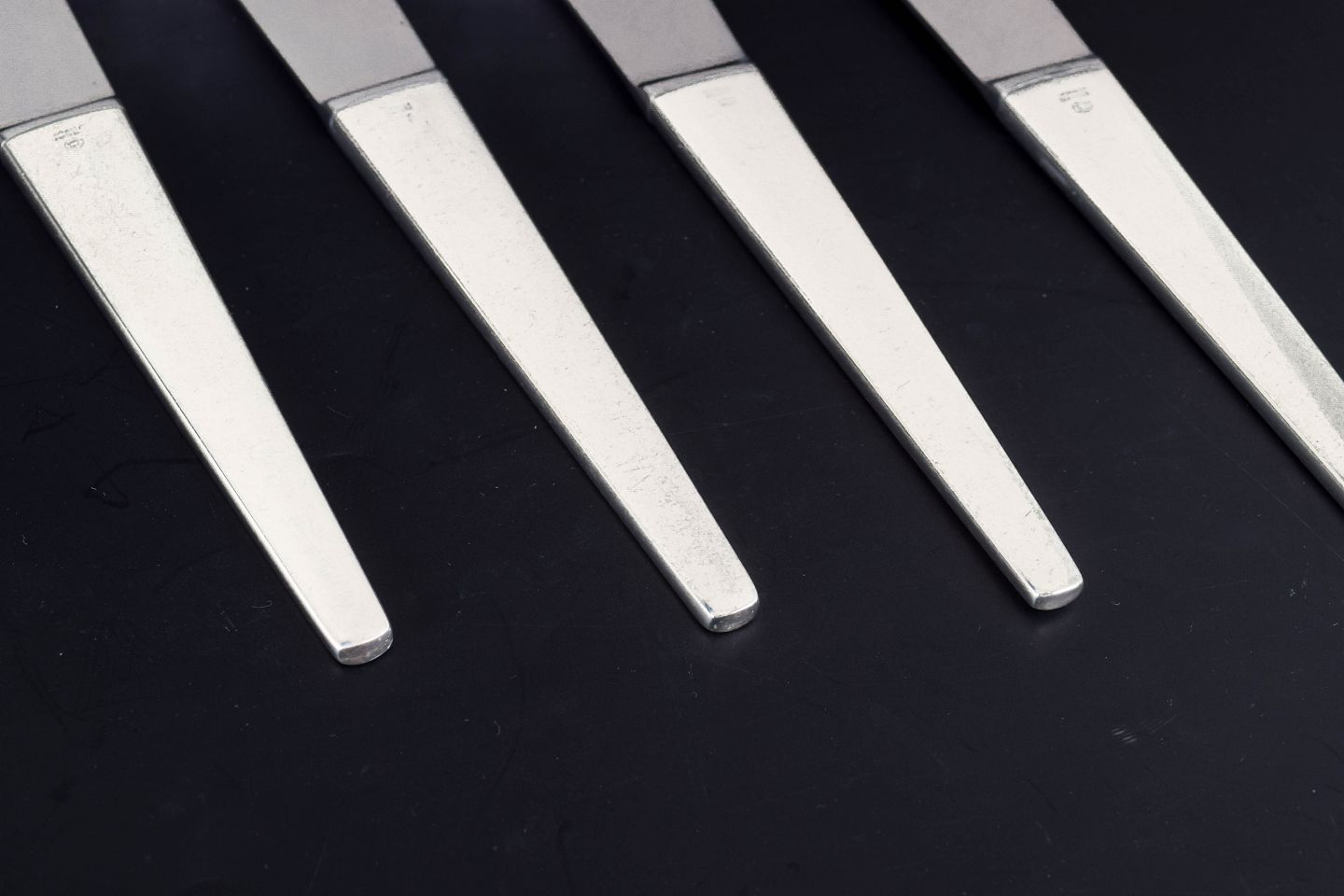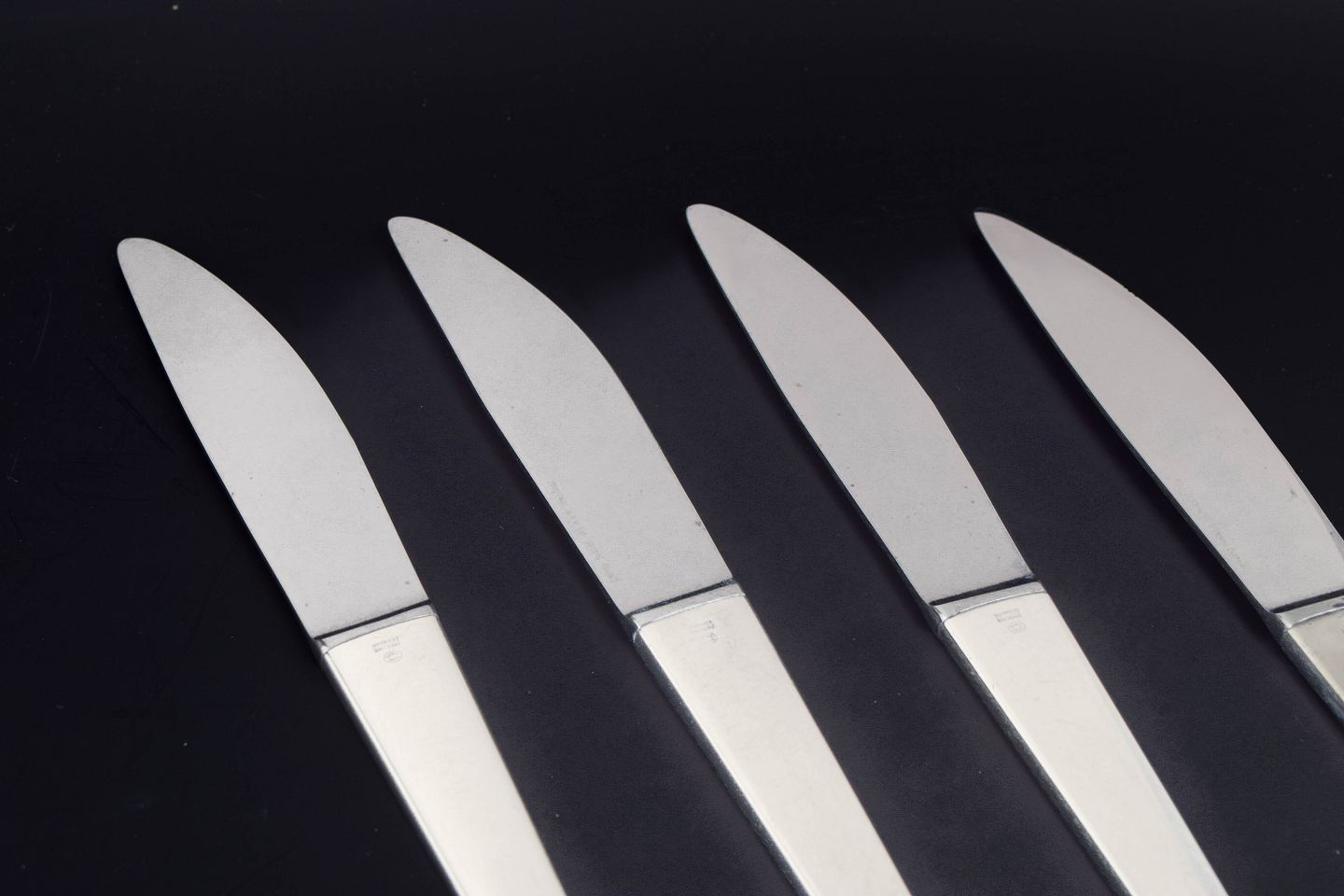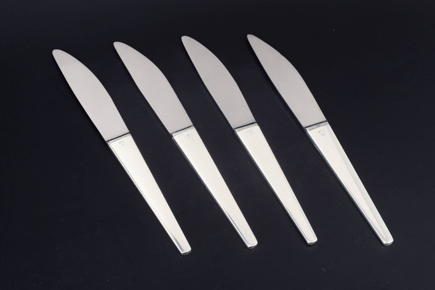Henning Koppel for Georg Jensen, set of four dinner knives Caravel.Set of four dinner knives in stainless steel and sterling silver in the Caravel model designed by Henning Koppel for Georg Jensen. The design features clean modern lines and a slender tapered form characteristic of Koppel’s functionalist approach.