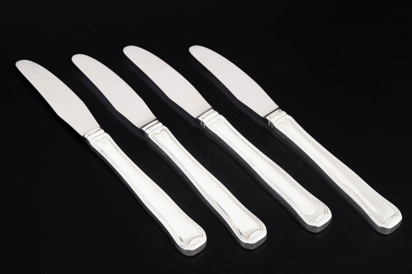 Georg Jensen, set of four lunch knives Old Danish.Set of four lunch knives in stainless steel and sterling silver with handles in the Old Danish pattern. The knives feature slender stainless steel blades and elegant silver handles with the characteristic double reeded border that defines this classic Georg Jensen design.