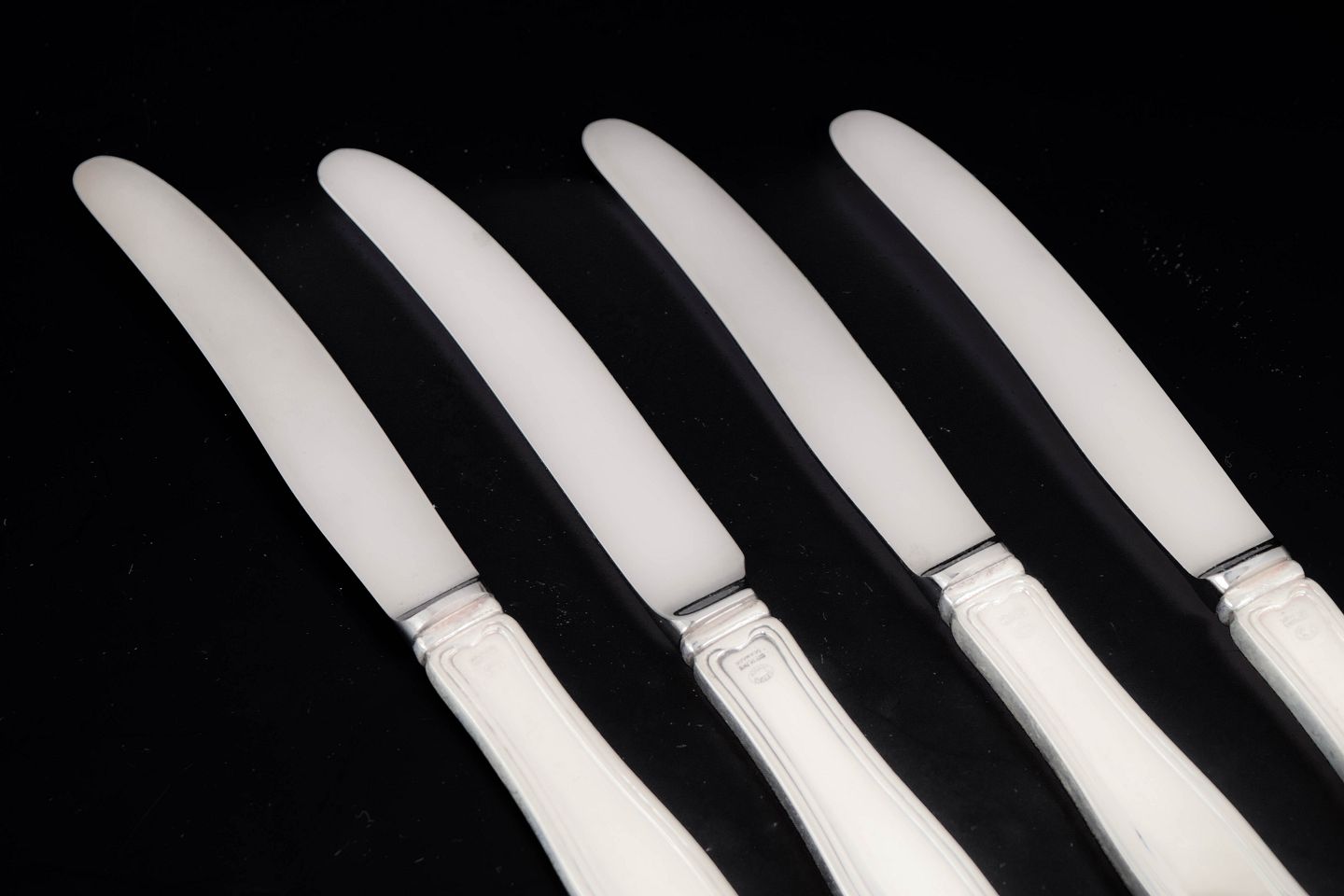 Georg Jensen, set of four fruit knives, Old Danish.Set of four fruit knives in stainless steel and sterling silver with handles in the Old Danish pattern. The knives feature slender stainless steel blades and elegant silver handles with the characteristic double reeded border that defines this classic Georg Jensen design.
