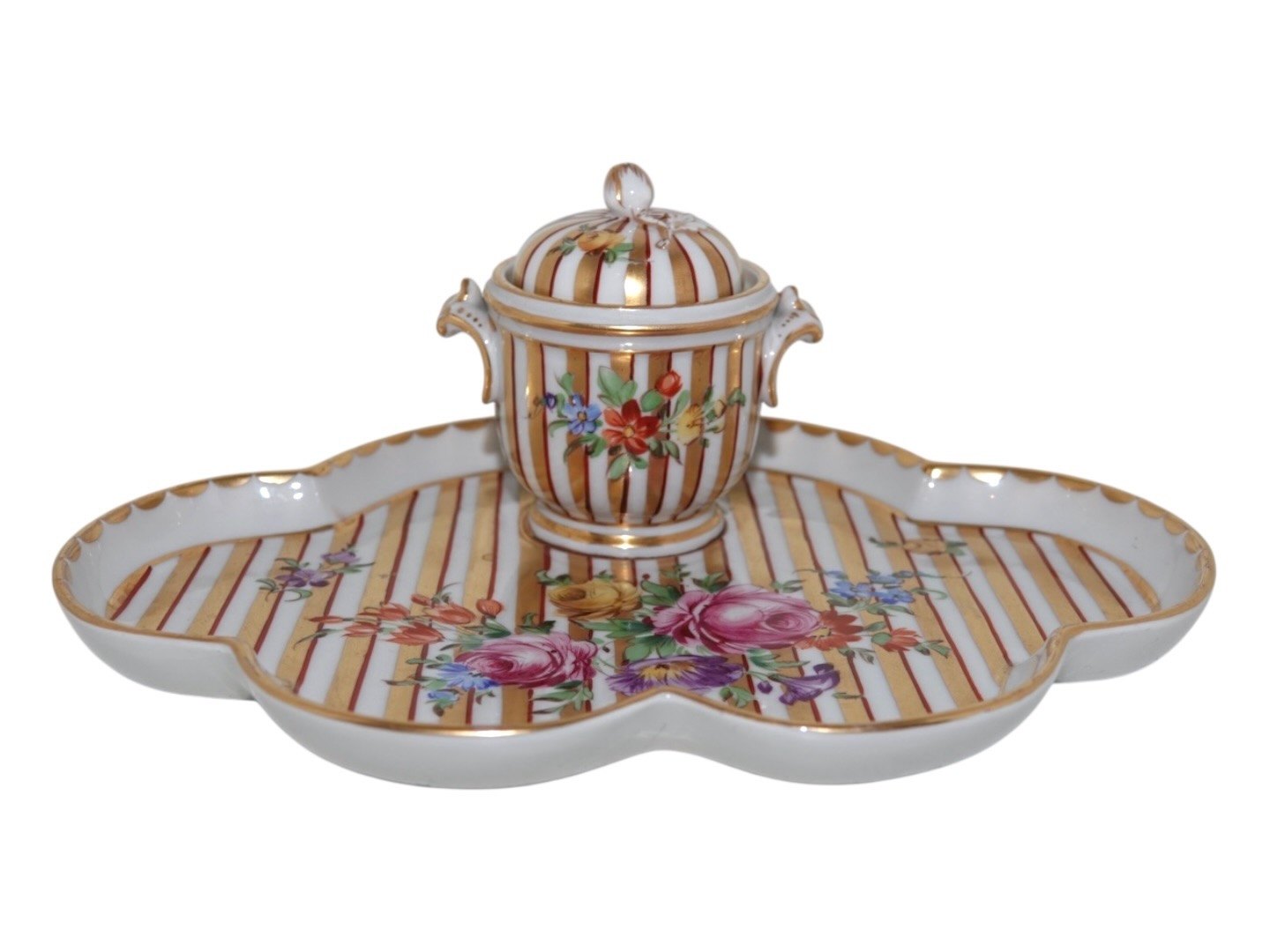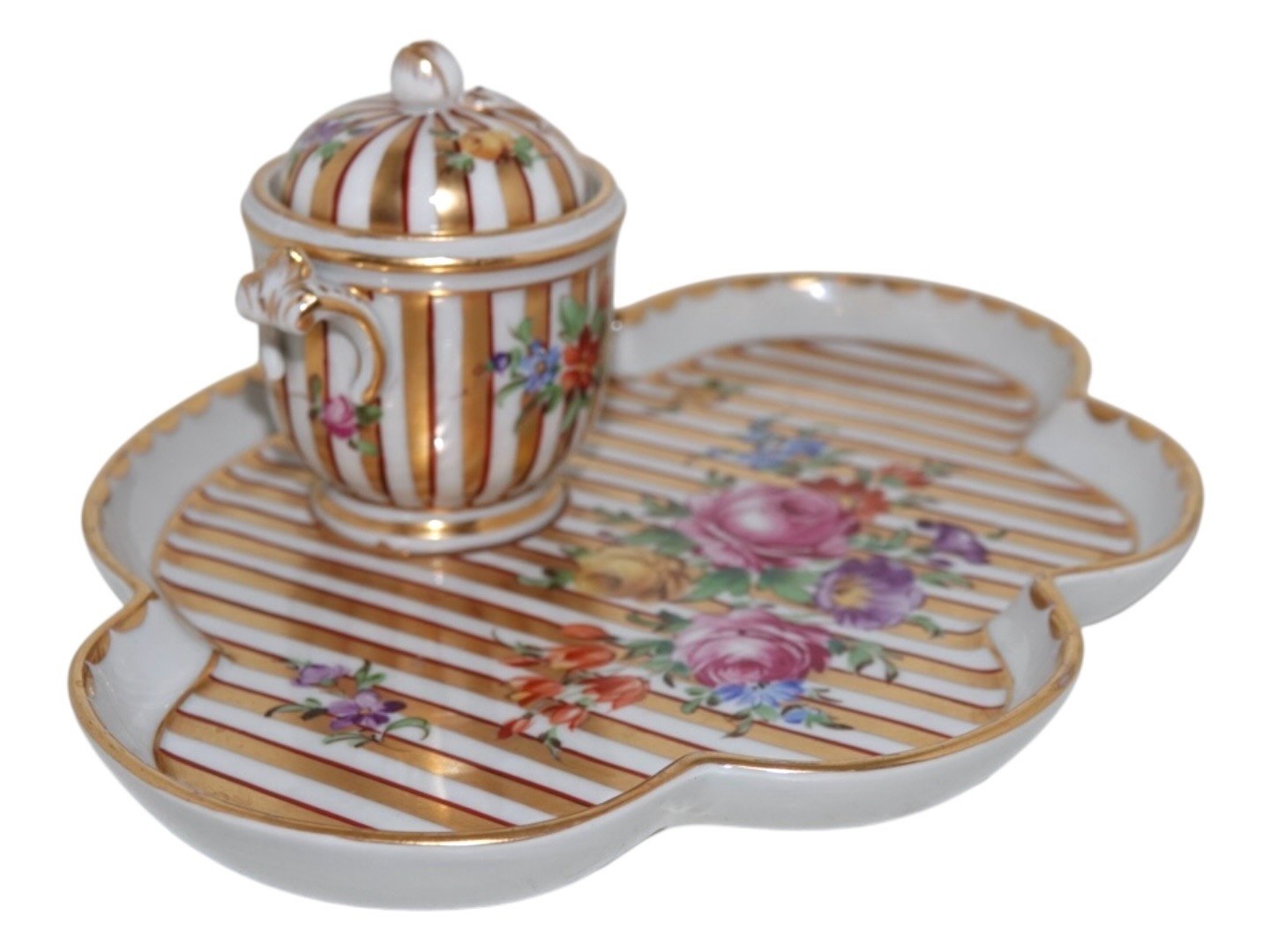 Porcelain most likely from Germany, inkwell with Saxon Flower decoration.Measures 20.7 by 17.0 cm.