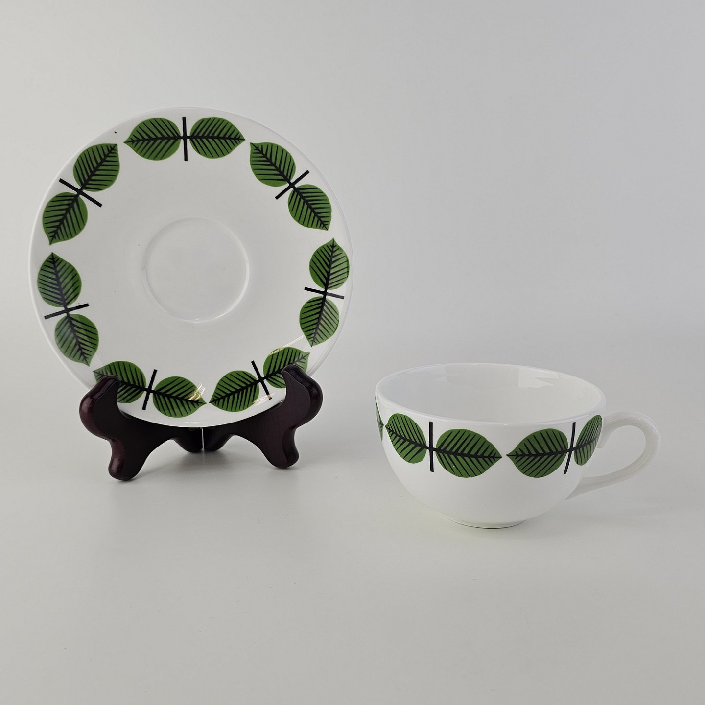 Stel i hvidt porcelæn med dekoration af grønne blade.