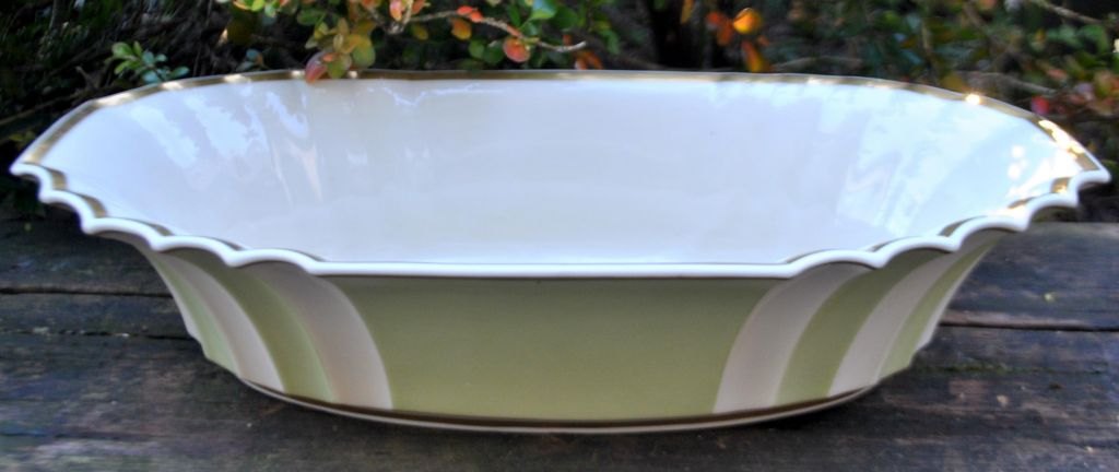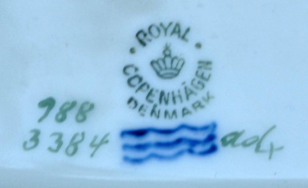 Royal Copenhagen jardiniere 988/3384, 20th century. Copenhagen, Denmark. Cream-colored with green background and gilding. Stamped. H: 9.3 cm. L: 37.5 cm. W: 19.5 cm.Item number: 29050