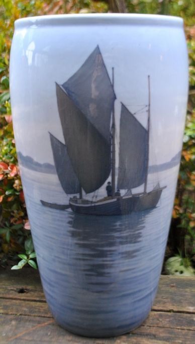 Royal Copenhagen large vase with ships, no. 2105/66, Denmark. Painted in blue, gray and brown shades. Stamped. H: 35 cm. Dia: 18 cm.2nd Quality.