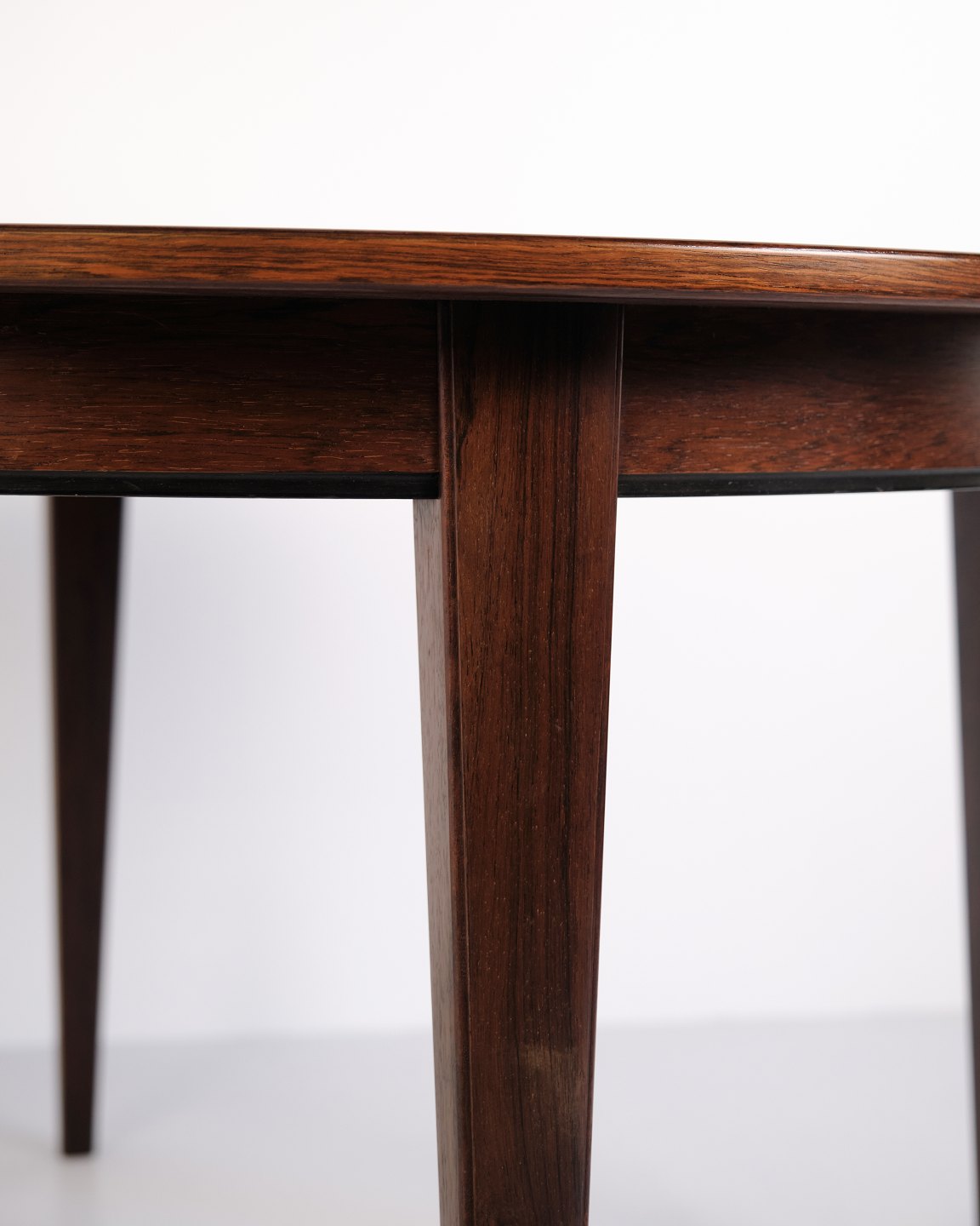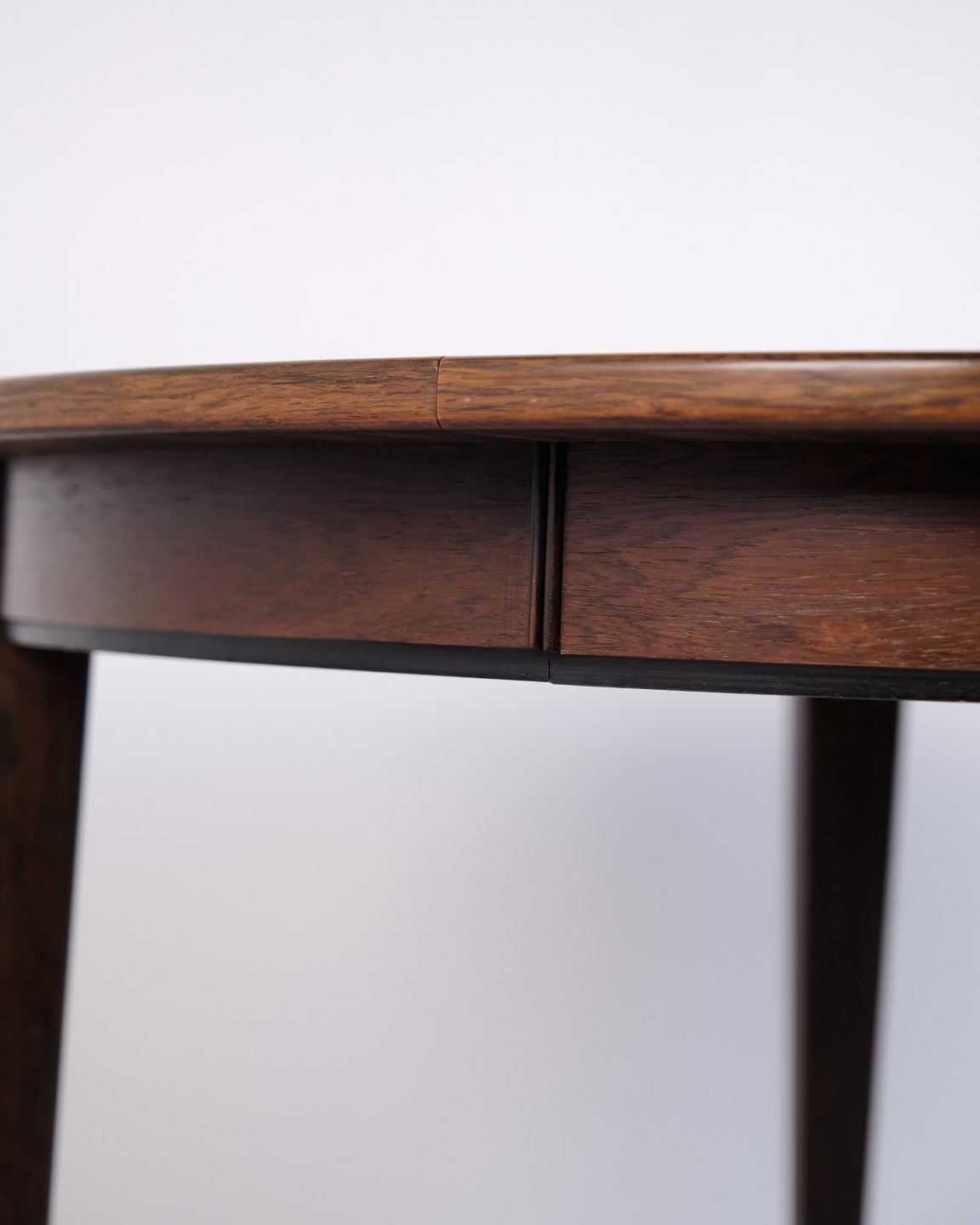 Round dining table model 55 designed and manufactured by Omann Jun in 1964. The table is made in rosewood veneer and stands on elegant tapered legs, characteristic of Danish furniture design from the period. The round shape and simple form give the table a classic and timeless appearance.The table comes with two extension leaves made in mahogany veneer. Under the tabletop there is a key with a threaded tightening mechanism used for assembling and stabilizing the table.