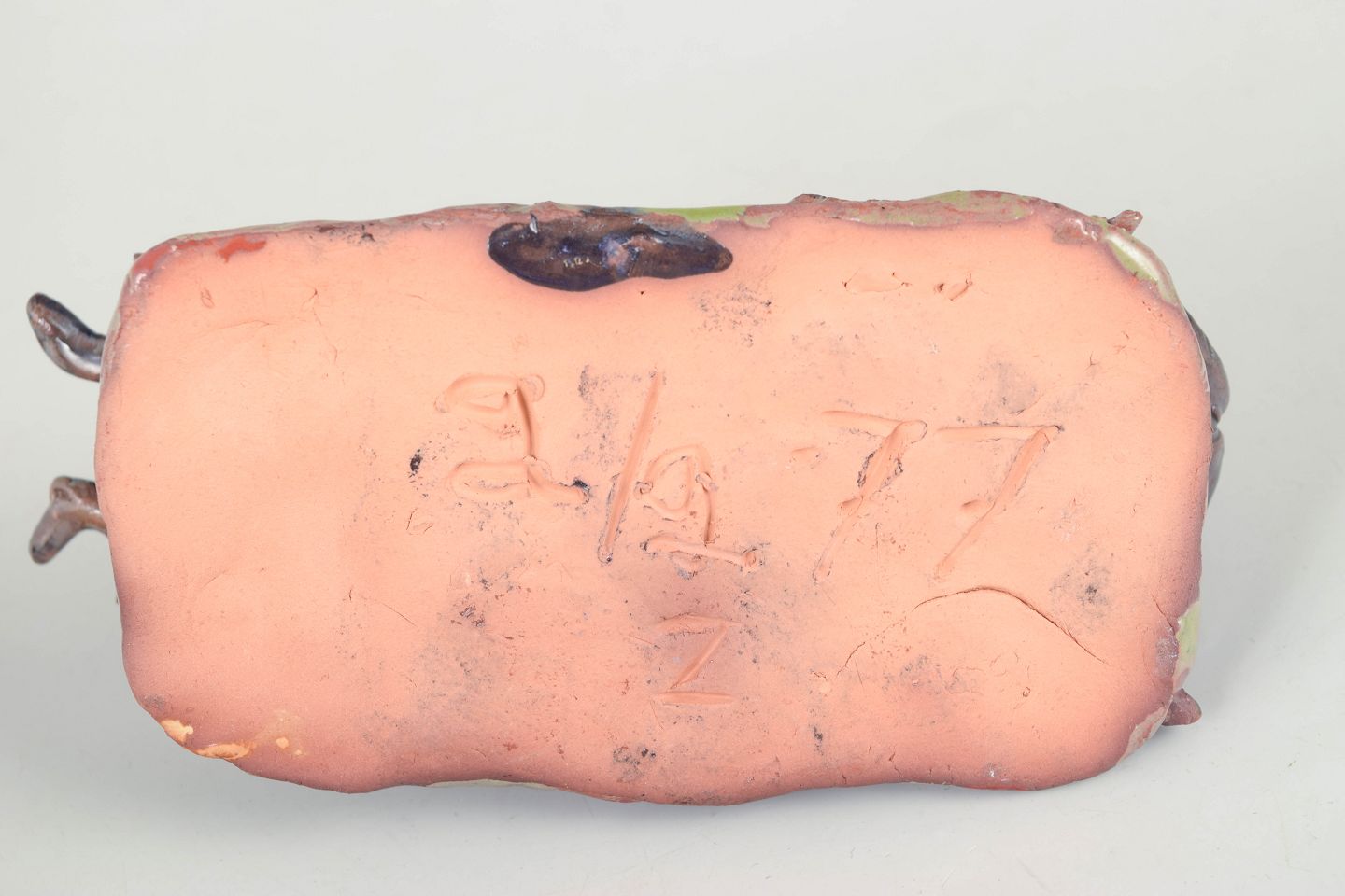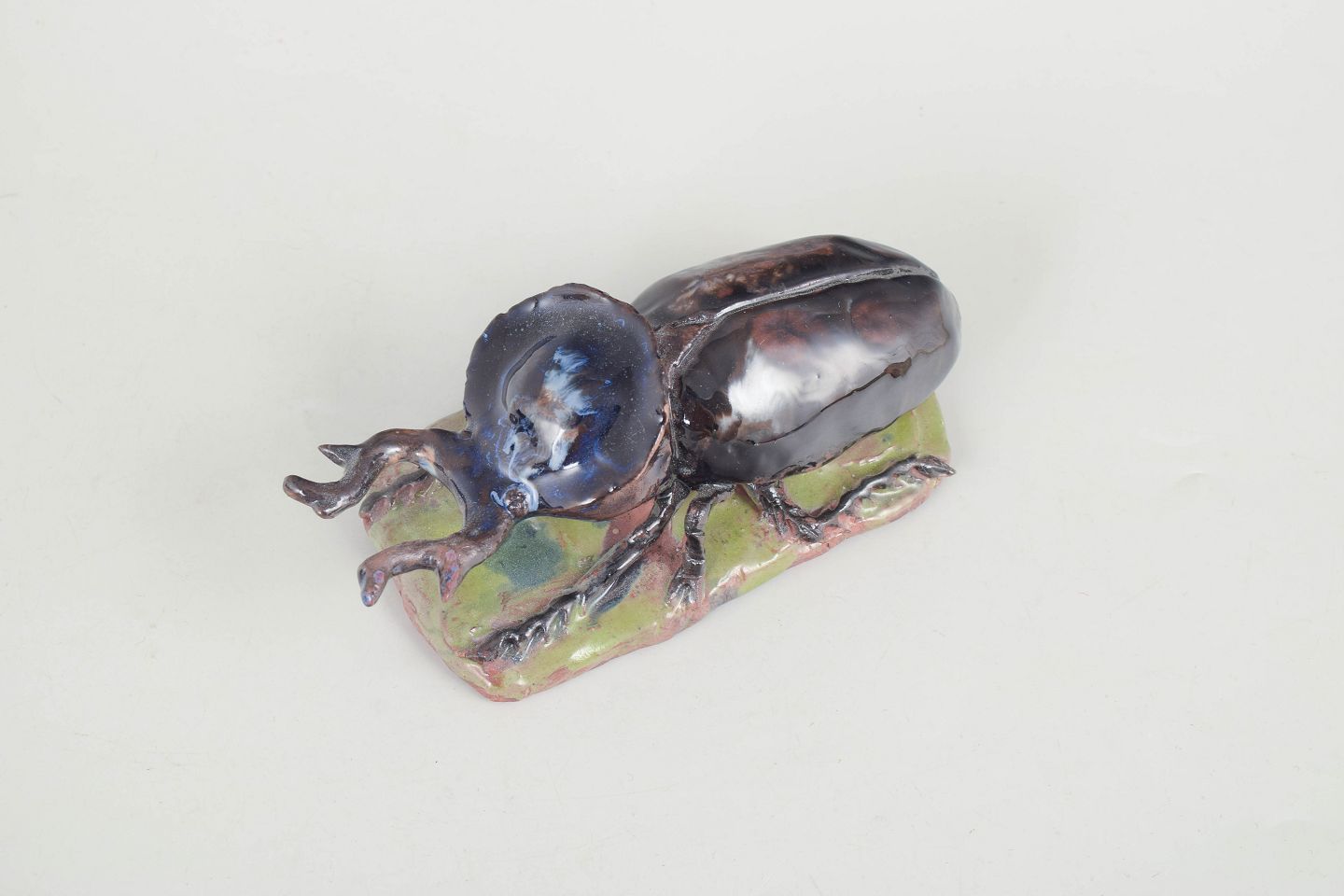 Unique ceramic sculpture depicting an insect executed in stoneware with glossy, iridescent glaze in dark blue, brown and green tonal nuances. The figure is modelled with naturalistic detailing and placed on a small clay base, giving the piece a lively and sculptural character. Signed and dated 1977.