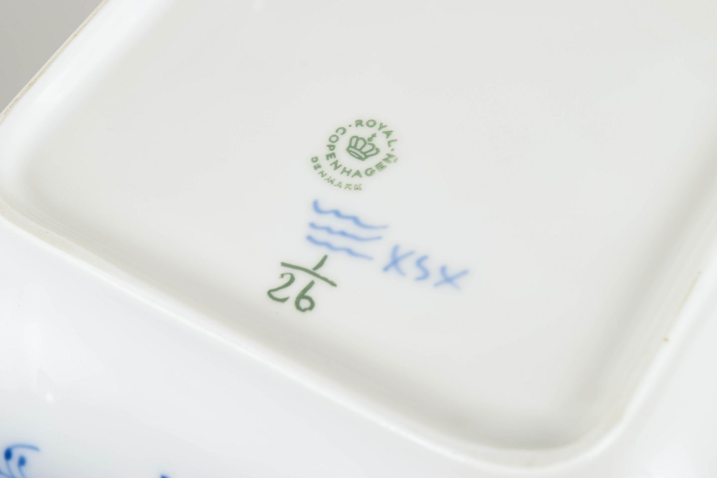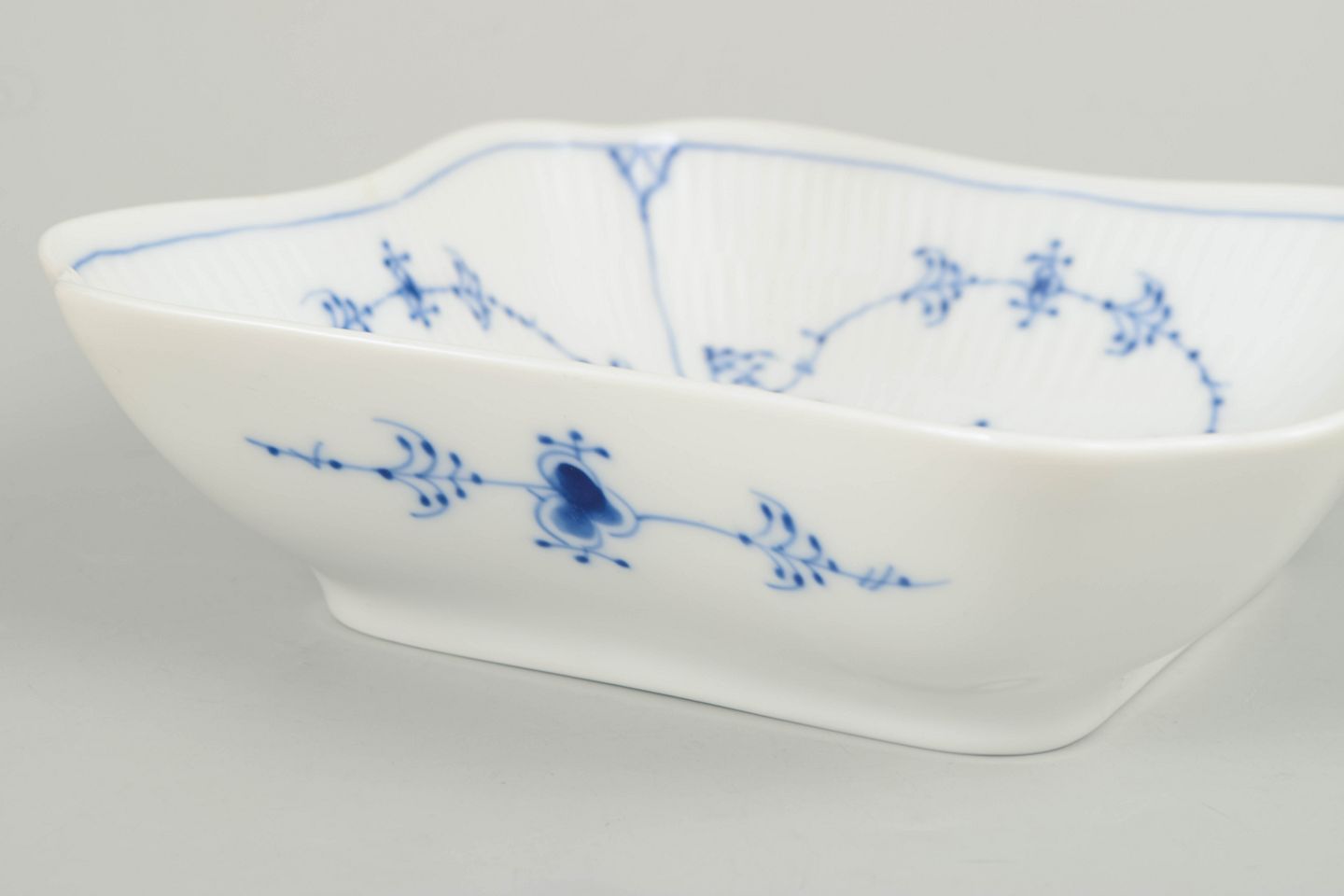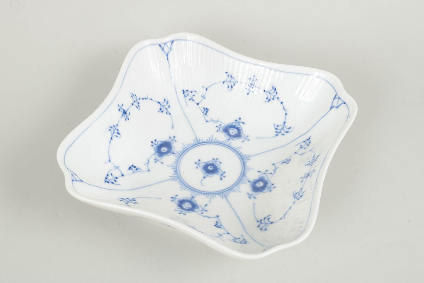Royal Copenhagen Blue Fluted Plain, square bowl.Hand-painted porcelain bowl decorated with the classic blue fluted pattern in cobalt underglaze. The bowl features an elegant square form with gently curved sides and fluted detailing in the body. At the centre is the characteristic floral motif surrounded by stylised floral garlands. Marked underneath with the Royal Copenhagen factory mark and first factory quality. Model 1/26.