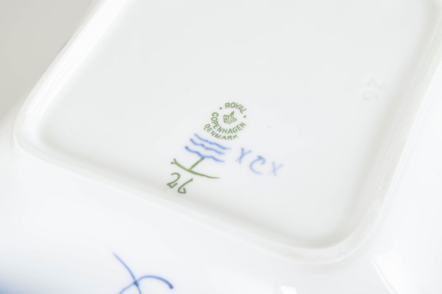 Hand-painted square porcelain bowl decorated with the classic blue fluted pattern in cobalt underglaze. The bowl features softly curved sides with fluted detailing and a central floral motif surrounded by stylised floral garlands. Marked underneath with the Royal Copenhagen factory mark, cancelled with one incised line through the mark. Model 1/26.