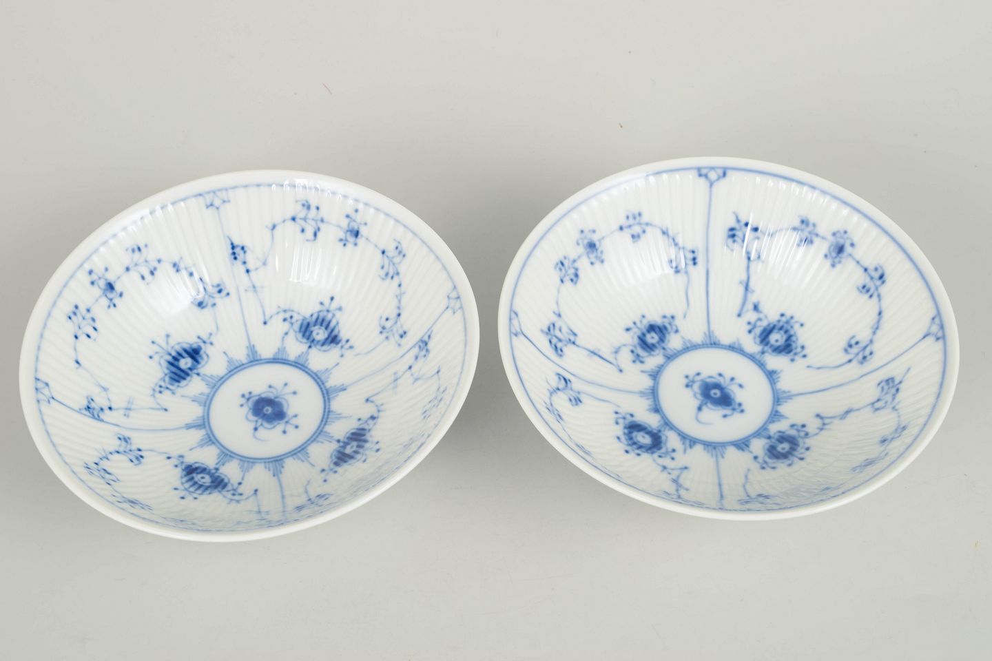 Royal Copenhagen Blue Fluted Plain, set of two bowls.Set of two hand-painted porcelain bowls decorated with the classic blue fluted pattern in cobalt underglaze. The bowls feature an elegant fluted form with slightly flared rim. Marked underneath with the Royal Copenhagen factory mark and first factory quality. Model 1/290.