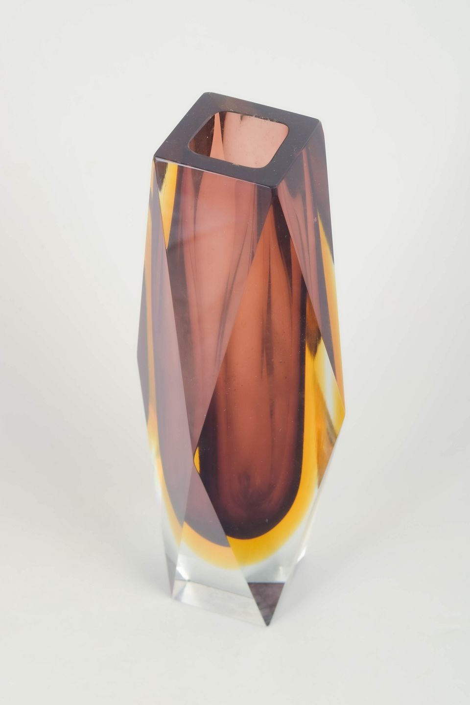 Murano, vase.Faceted art glass vase in clear glass with encased amber core and geometrically cut sides, produced in the characteristic Murano style with a strong sculptural form.