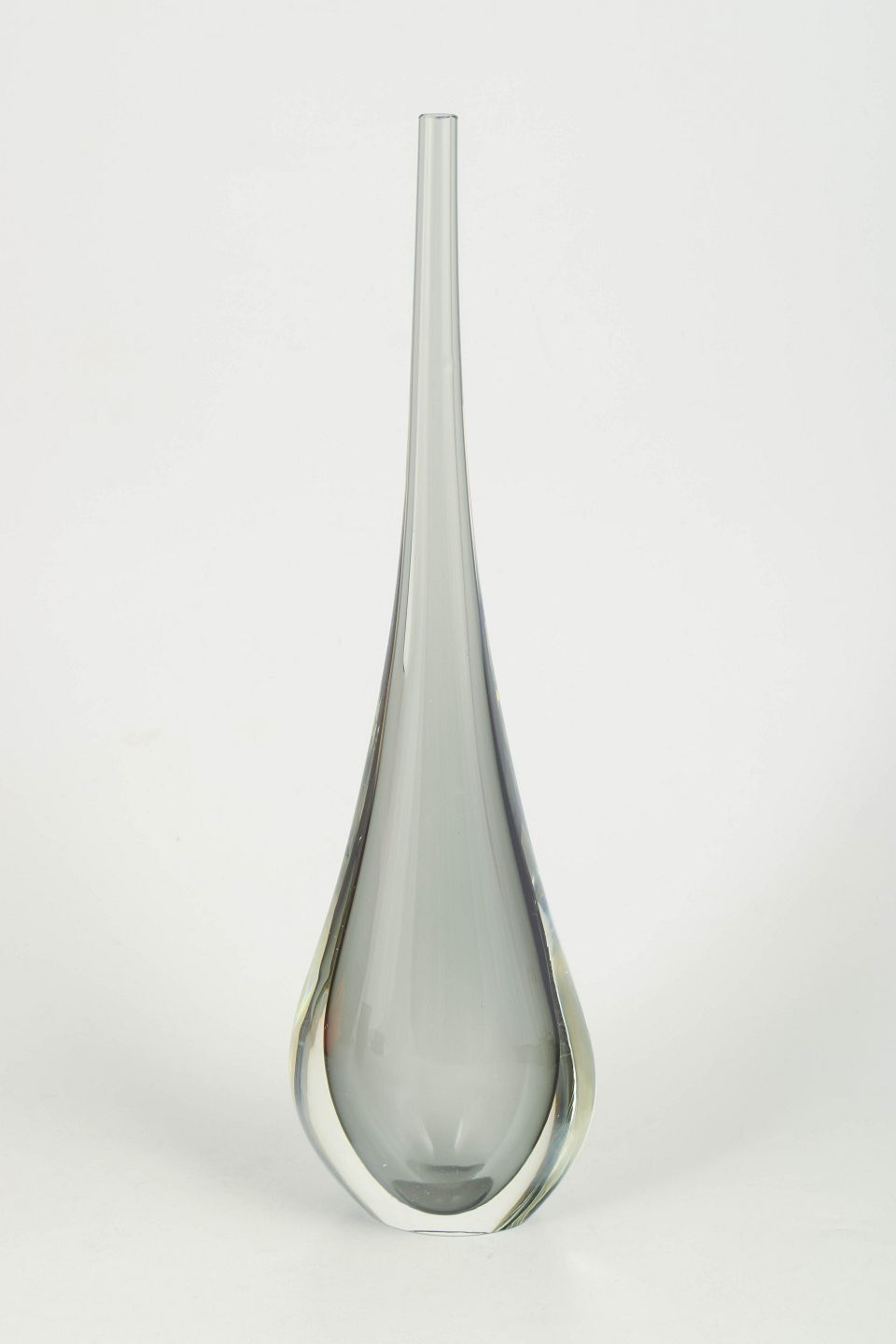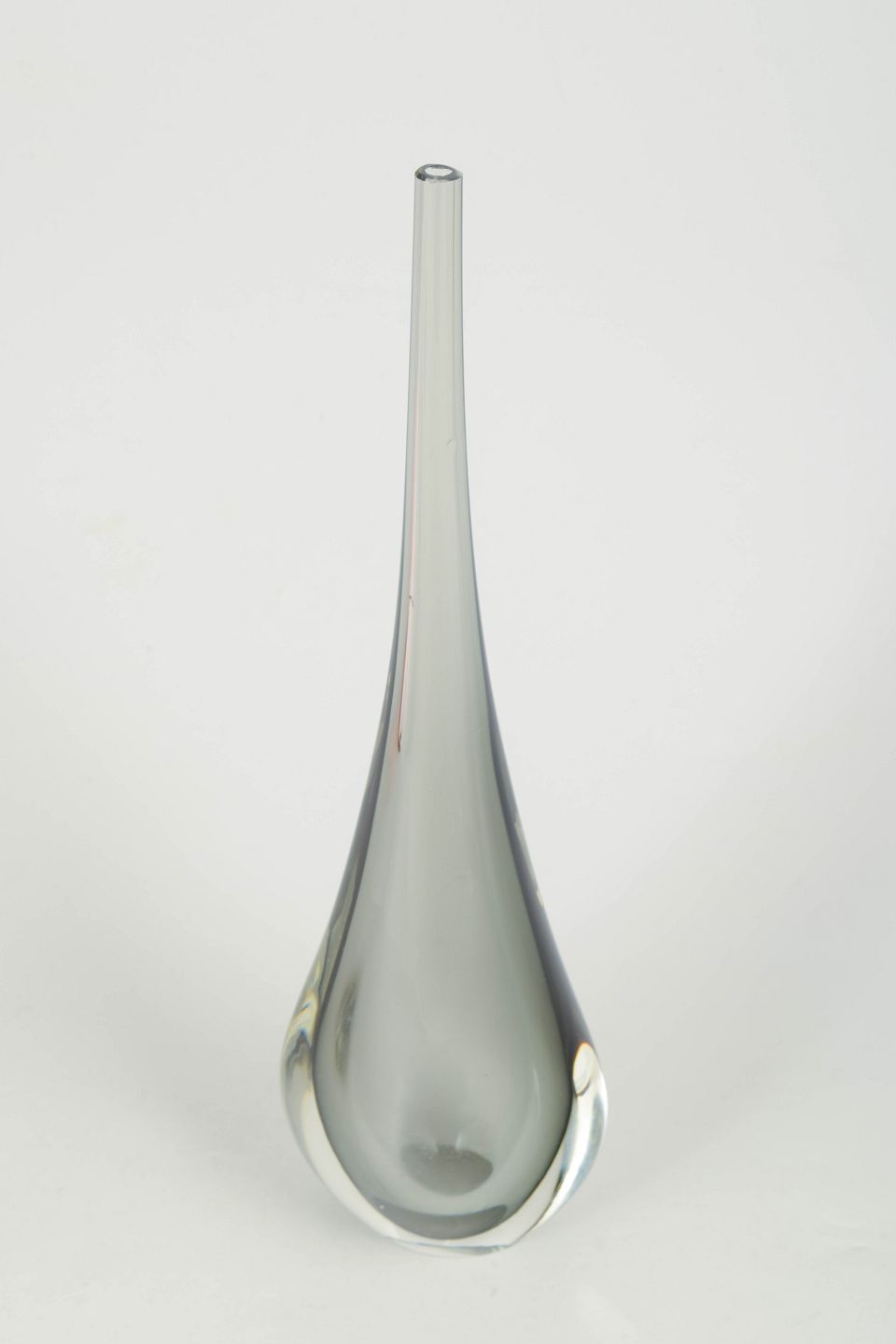 Murano, vase.Slender art glass vase in clear glass with elegant drop-shaped silhouette and long narrow neck, characteristic of Murano glass with a heavy base and refined sculptural form.