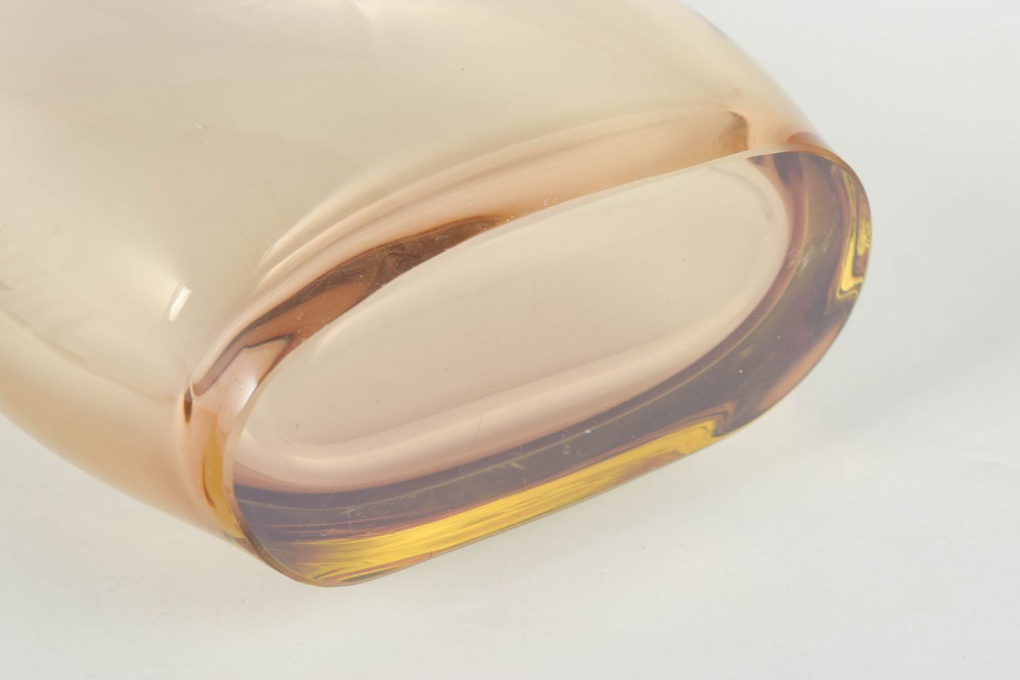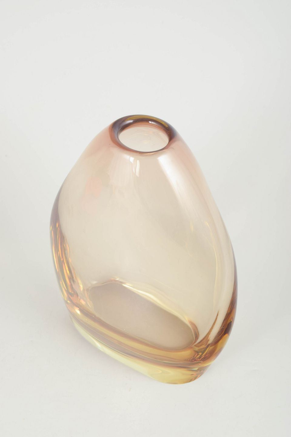 Murano, vase.Elegant art glass vase in clear glass with warm amber tone and softly organic form, characteristic of Murano glass with a heavy base and sculptural silhouette.