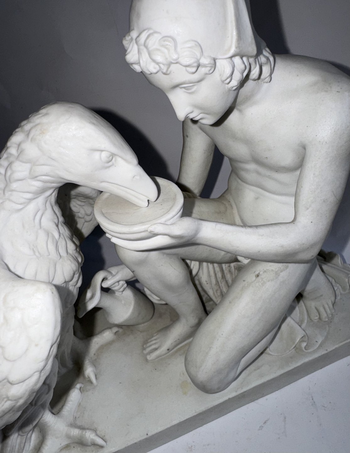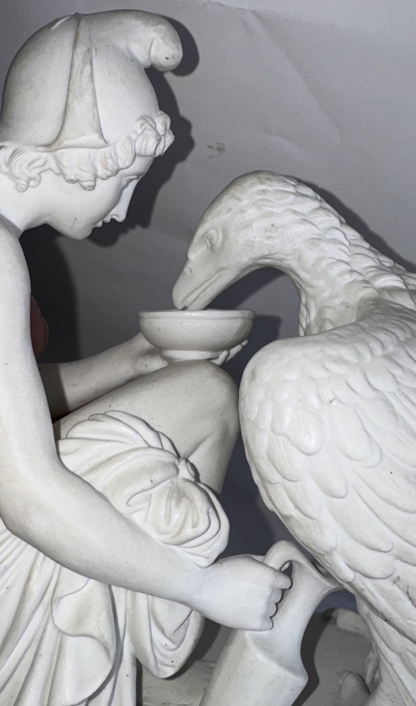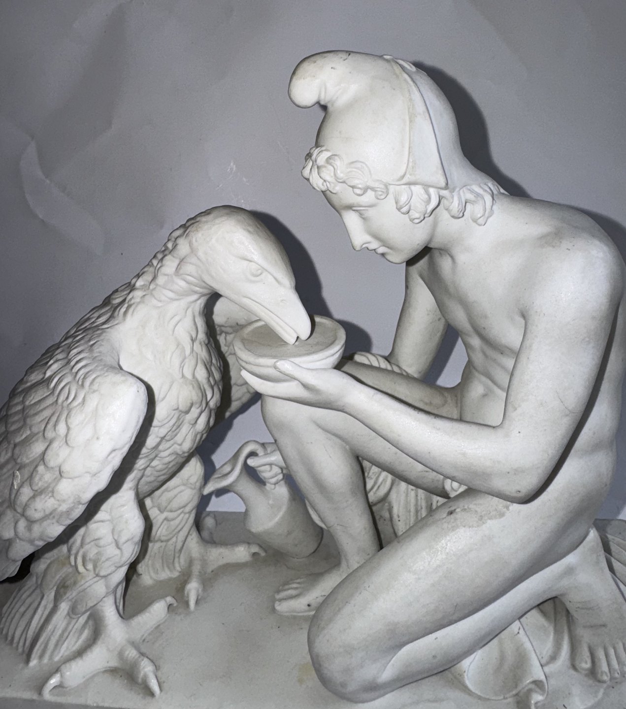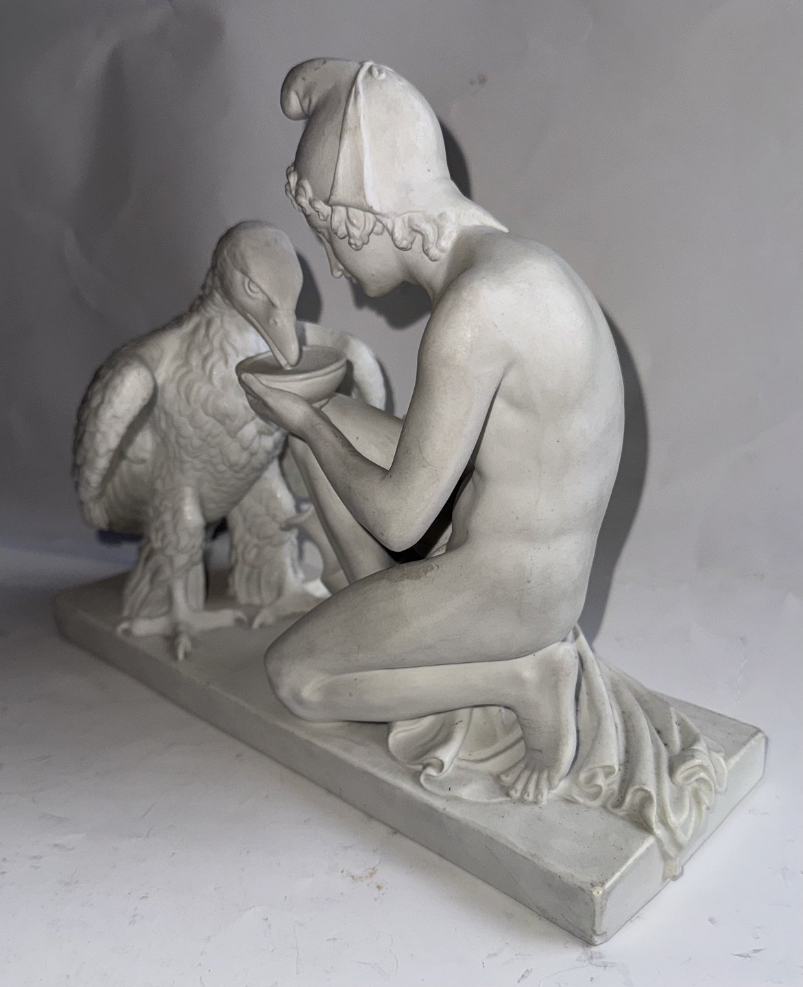 Bing & Grøndahl figure in biscuit depicting Bertel Thorvaldsen's version of Ganymedes with Jupitar's eagle. Made in the late 19th. century. Do have a small chip on the bottom rim of the base. Otherwise in good condition. Factory mark on the bottom of the base with B&G in blue. The figure is 20,5 cm high and 26 cm long. The base measures 9 cm x 24,5 cm. Dealer
