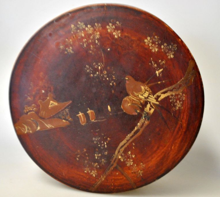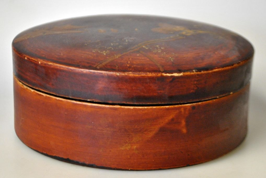 Chinese wooden box with gold paint, 19th century. Decorated with birds and landscape. H: 7 cm. Dia: 17 cm.
