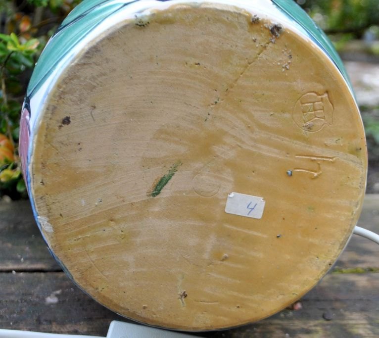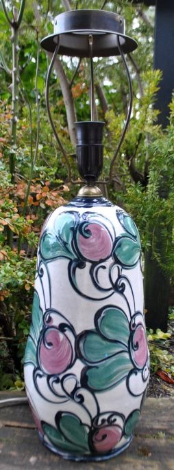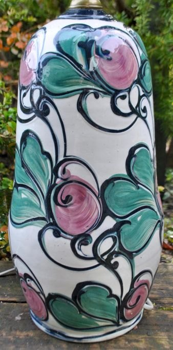 Table lamp from Hornbæk Keramik, 20th century. Denmark. Glaze in white, black, green and pink. Stamped: HK. H: 58 cm. Dia: 16 cm.
