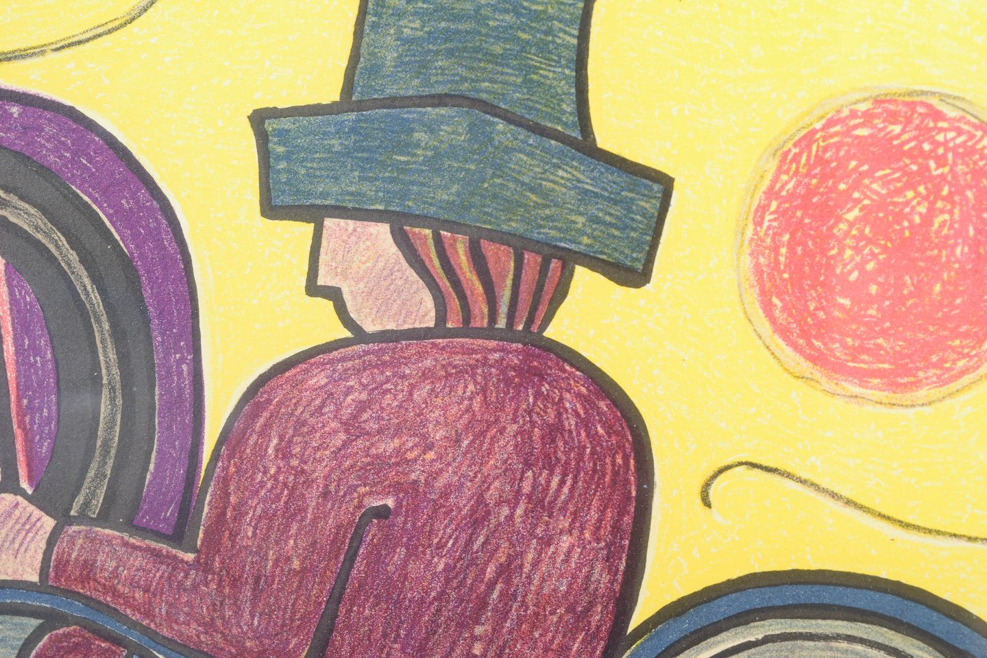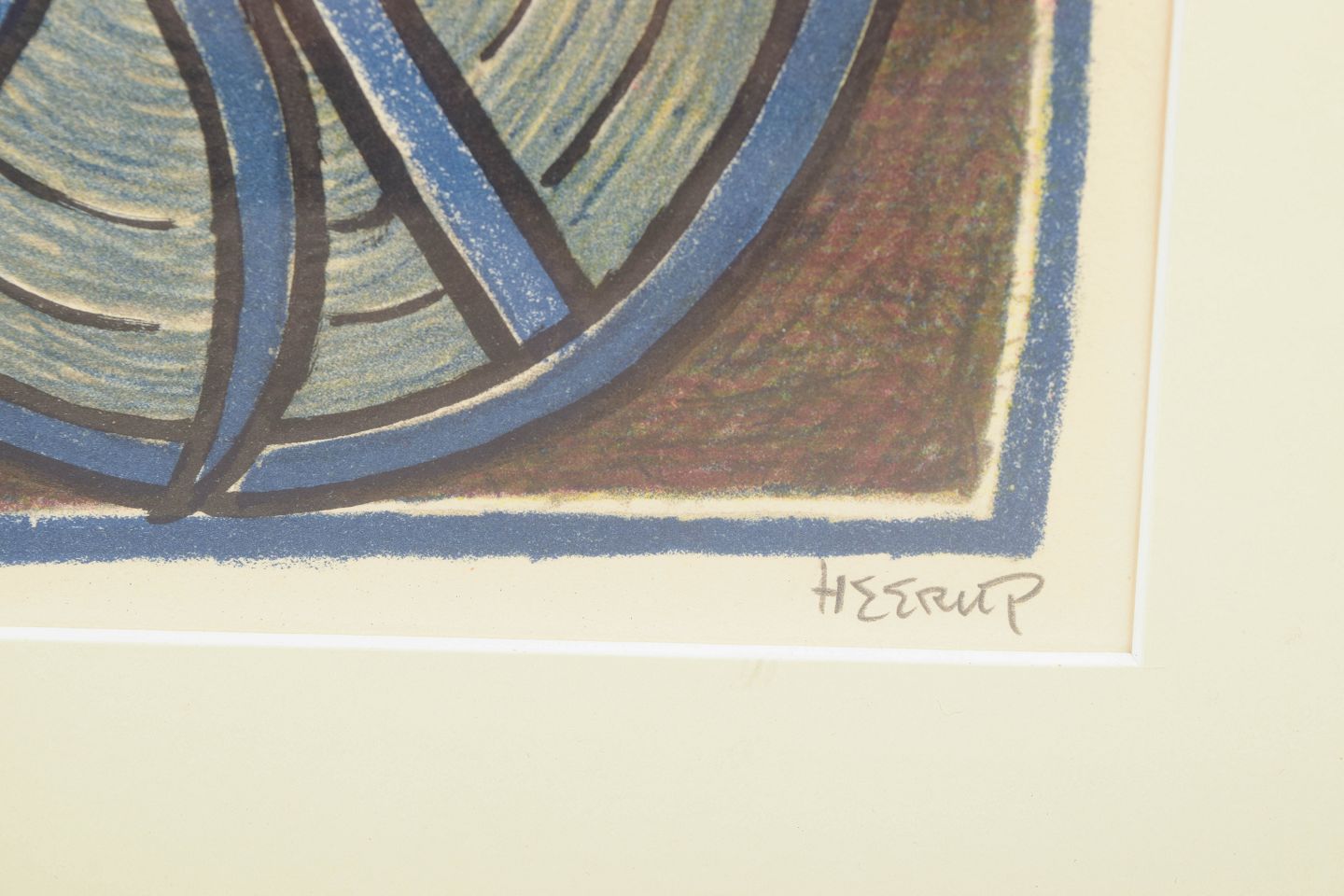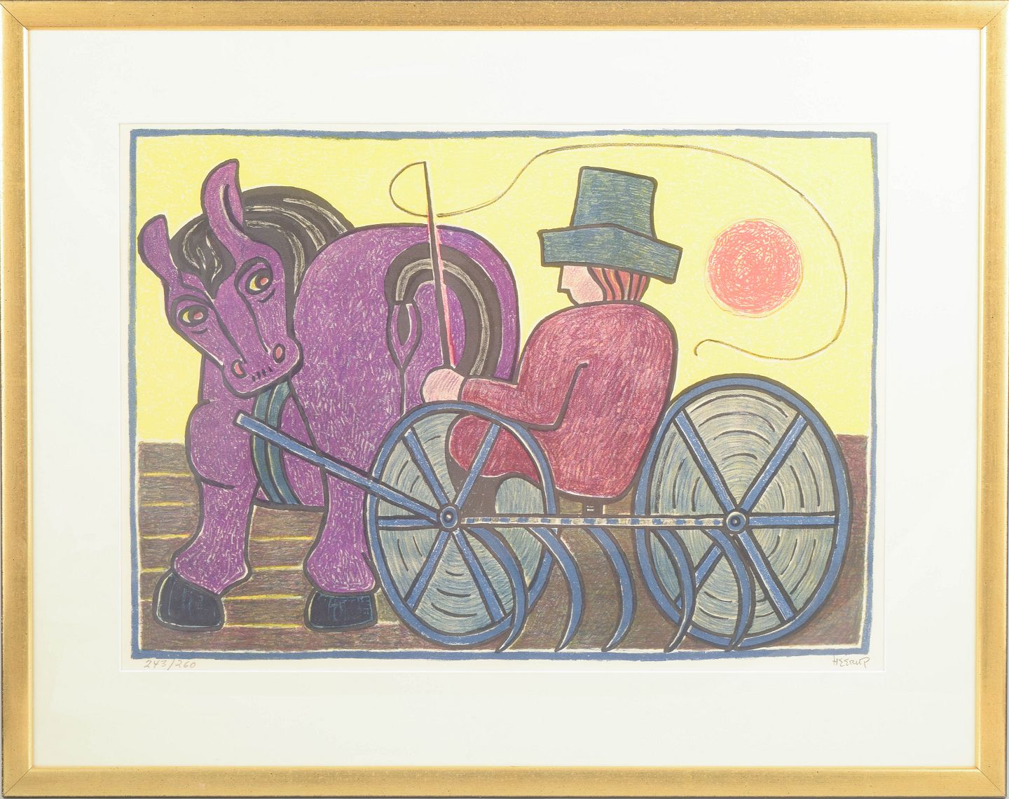 Henry Heerup, colour lithograph, listed Danish artist.Colourful graphic composition with a figurative motif of a man driving a horse cart, executed as a colour lithograph in the artist’s distinctive naïve and symbol-rich style, signed in pencil and numbered 243/260.