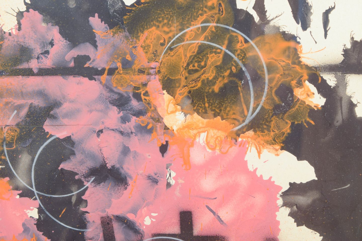 Abstract composition executed in watercolour on paper with expressive colour fields in pink, orange, black and violet tones combined with graphic lines and circular forms. The composition has a spontaneous and dynamic structure with layered textures and contrasts between translucent and darker areas of colour.