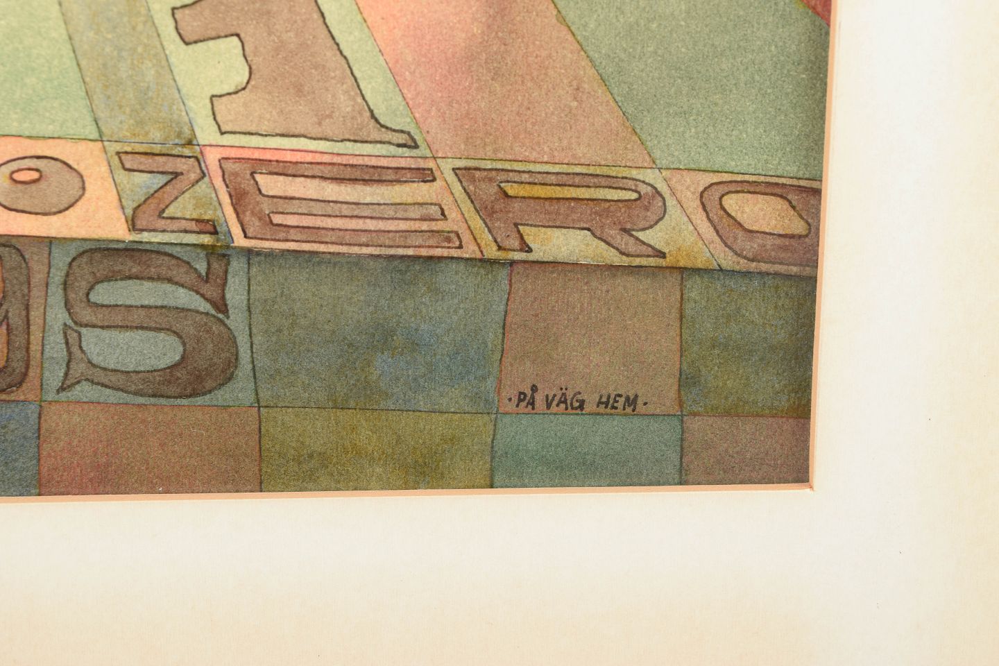 Surrealistisk komposition med symbolistiske og drømmeagtige elementer. Motivet viser en abstrakt rumlig scene med en grøn sfærisk form og stiliserede vingeformer omgivet af røde lineære former mod en mørk blå baggrund, over et geometrisk felt med tal og tegn. Signeret H. Stenberg og med titel : “På väg hem”.