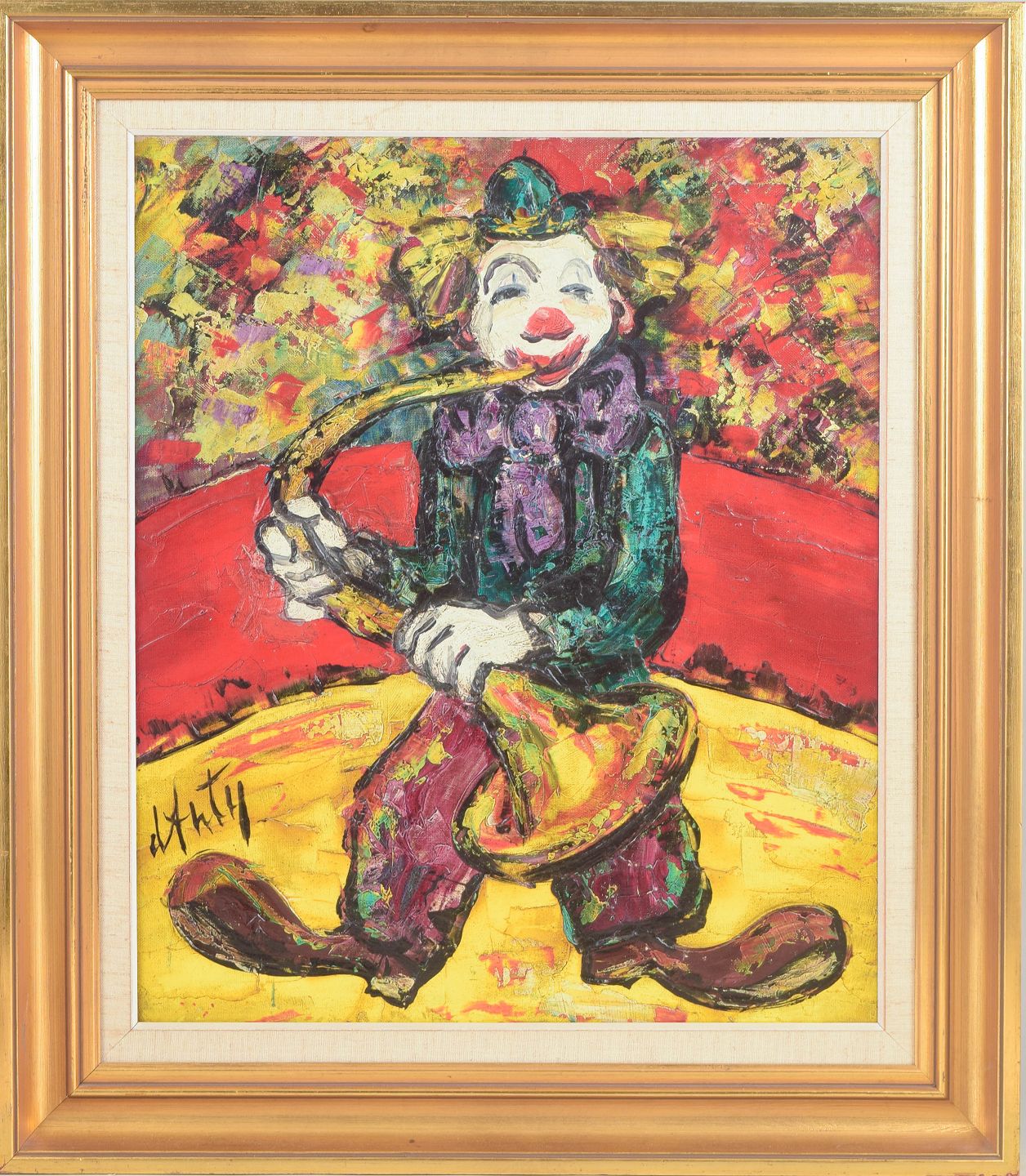 Colourful figurative composition depicting a clown playing a saxophone, executed with expressive brushwork and a vivid palette dominated by reds, yellows and greens. The painting is signed and reflects the artist’s characteristic style with thick impasto layers and strong outlined forms.