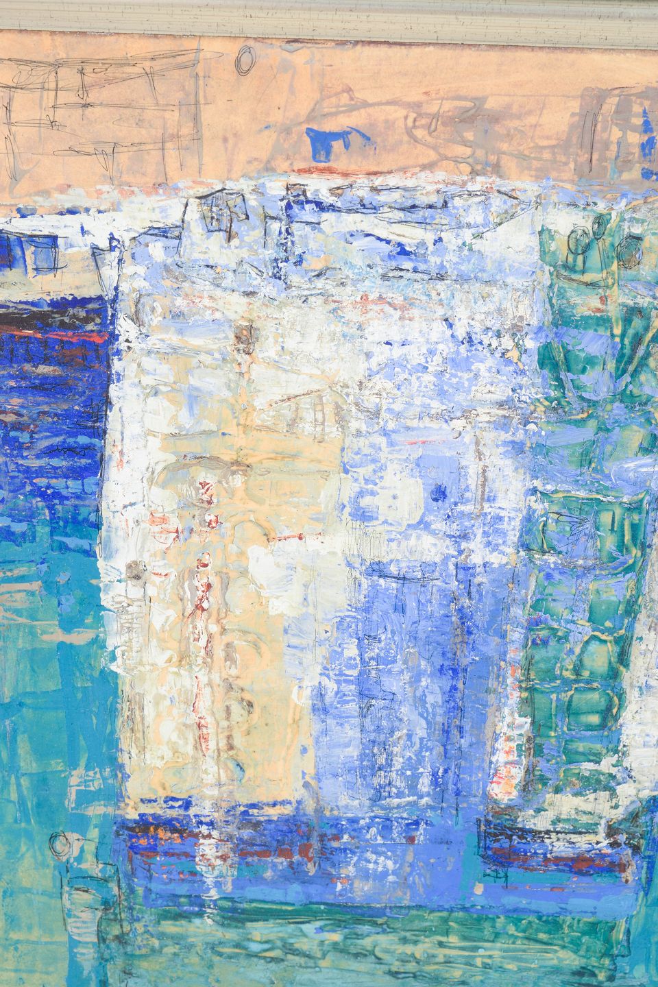 Lauri Nila, abstract composition, listed Finnish artist.Abstract composition executed in oil on board with textured brushwork and a nuanced palette dominated by blue and turquoise tones. Signed.