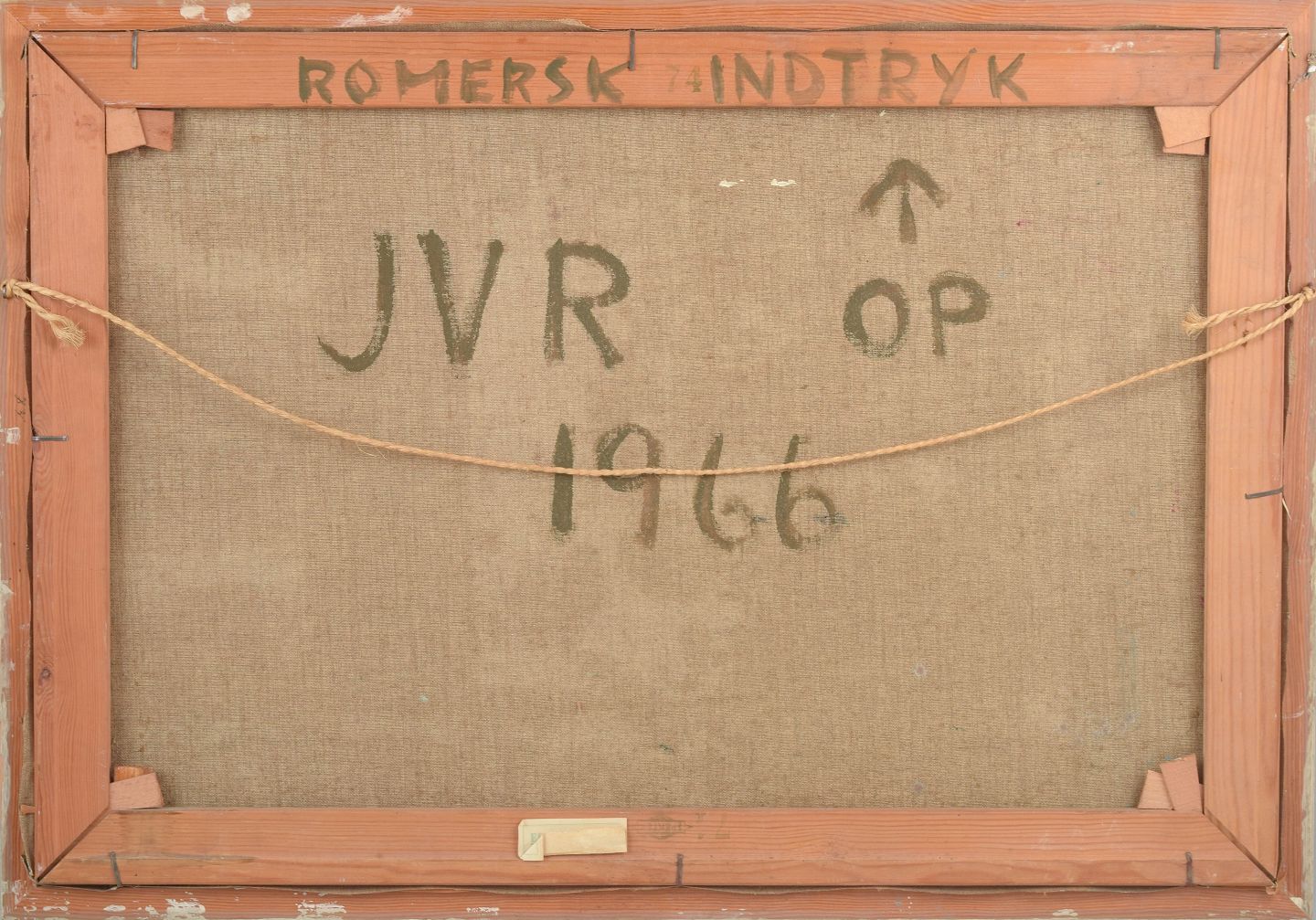 Abstract composition executed in oil on canvas with geometric and architectural forms in warm red and pink tones, signed JVR and dated 1966.