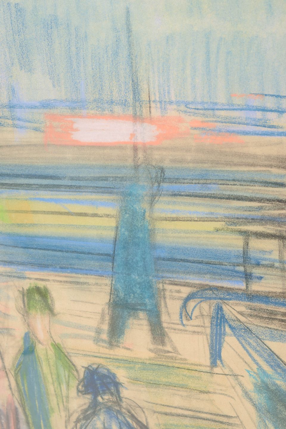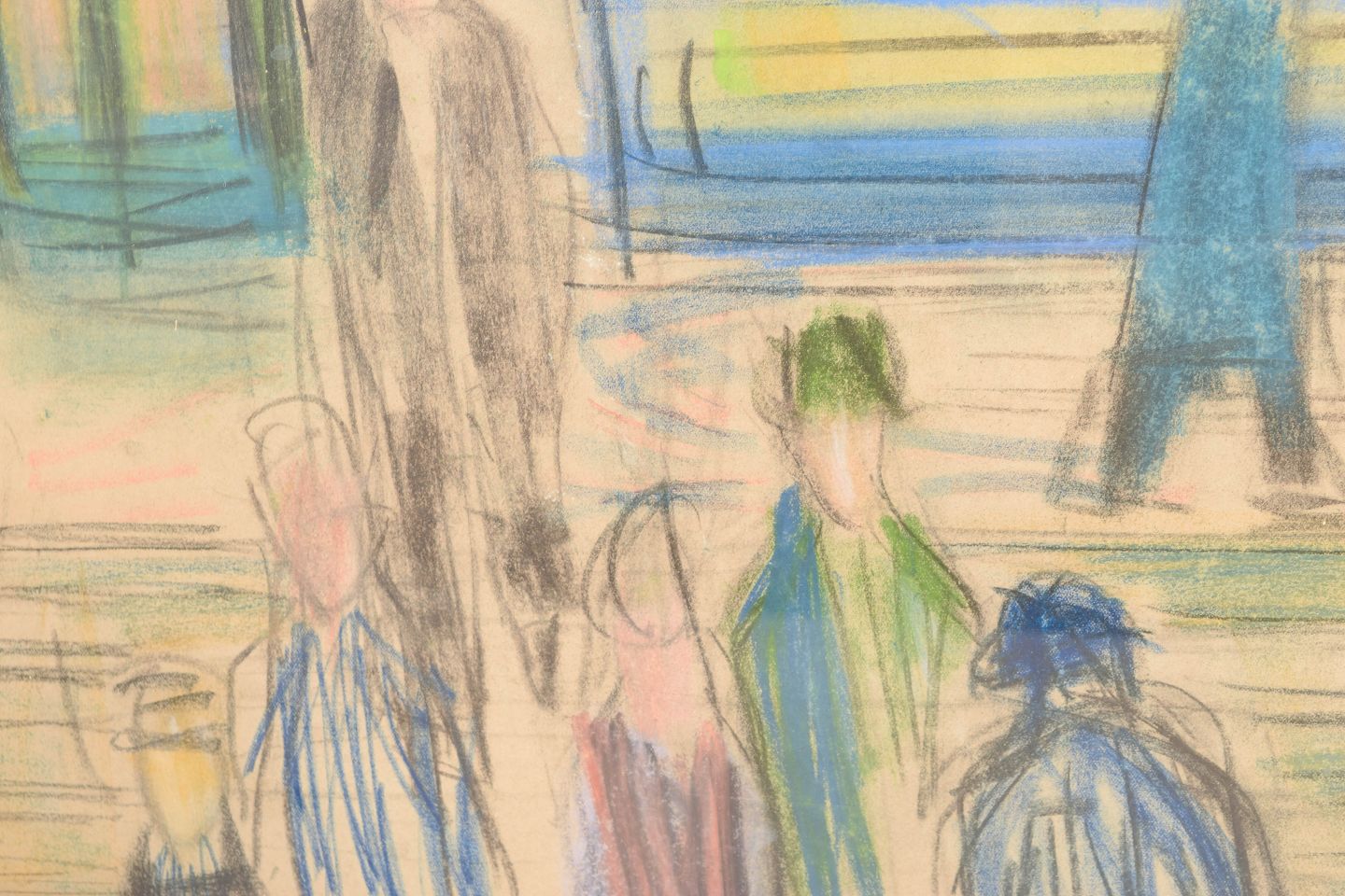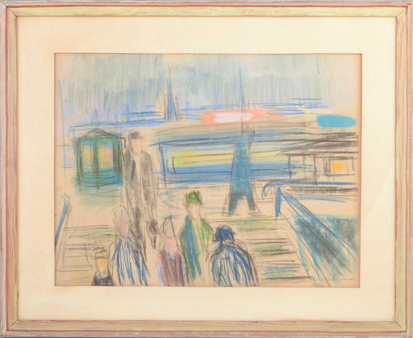 Brita af Klercker, crayon on paper, listed Swedish visual artist.Expressive composition with figures and architectural elements executed in crayon on paper, signed B. Klercker lower right. The work presents a stylised urban scene with people and structures rendered in a loose modernist manner and a light, atmospheric colour palette.