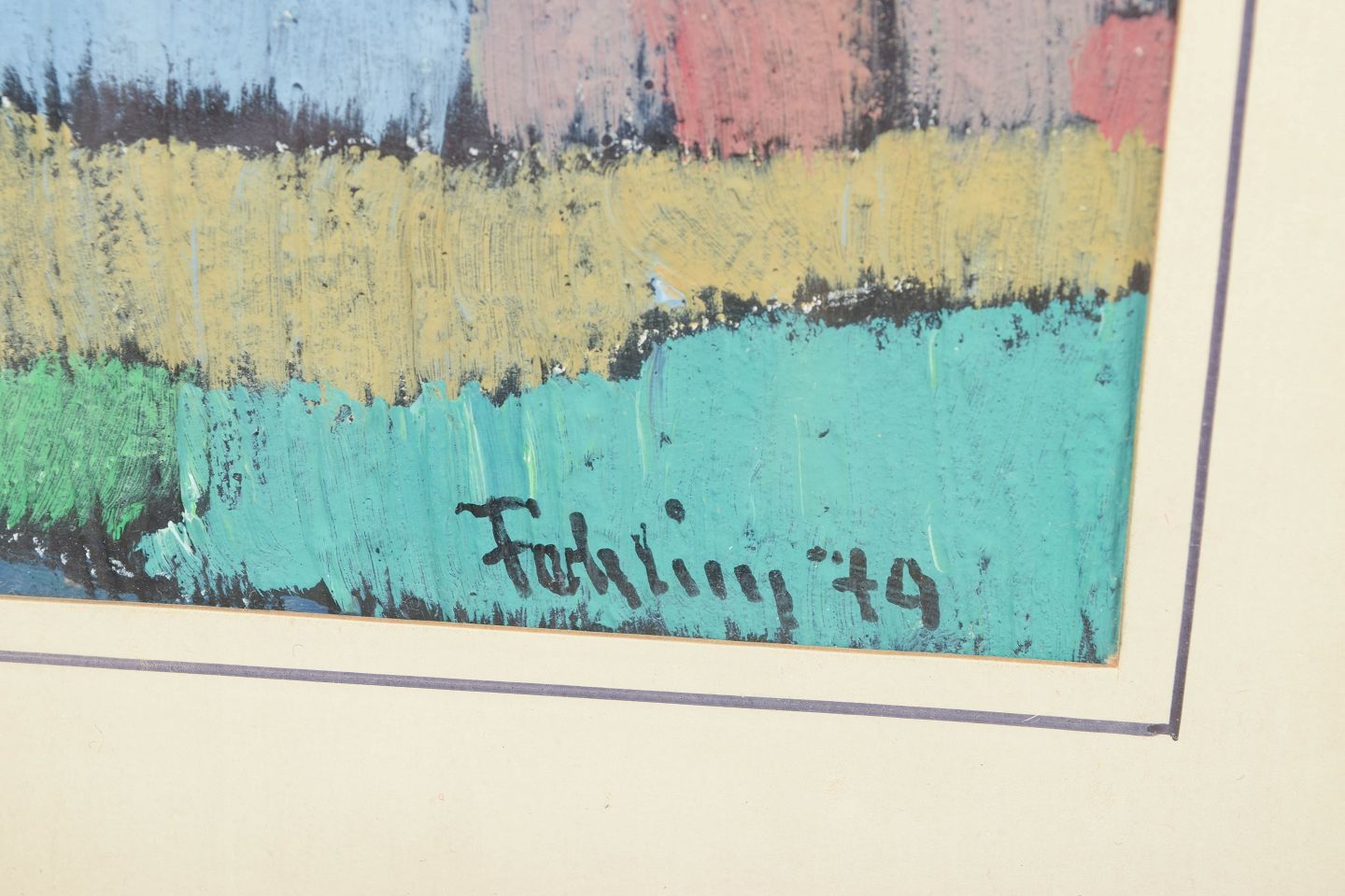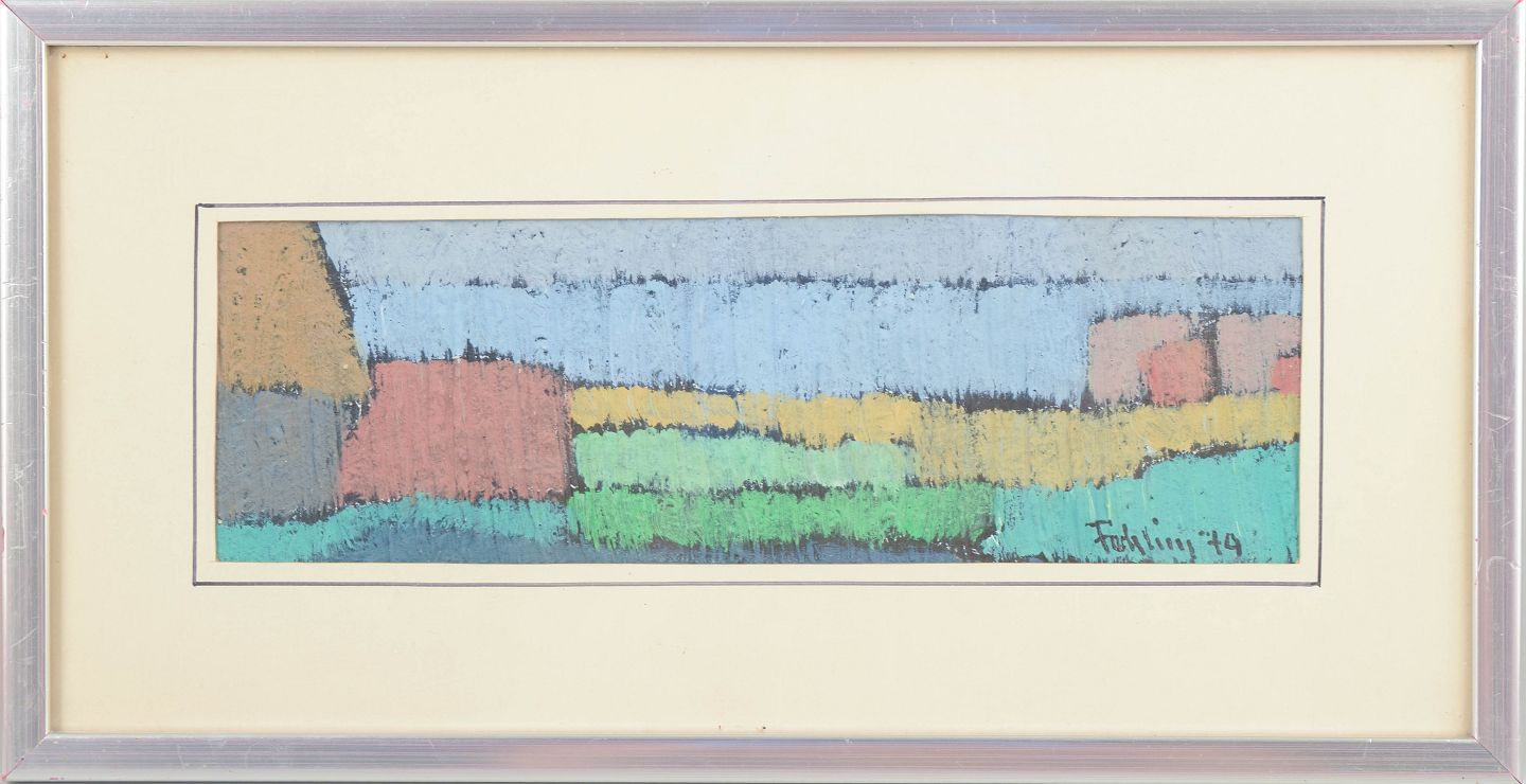 Gunnar Fohlin, oil on paper, listed Swedish artist.Abstract landscape composition executed in oil on paper with stylised forms suggesting houses and fields in an open landscape. The motif is constructed with horizontal colour fields in blue, green, yellow and pink tones with a darker horizon line.