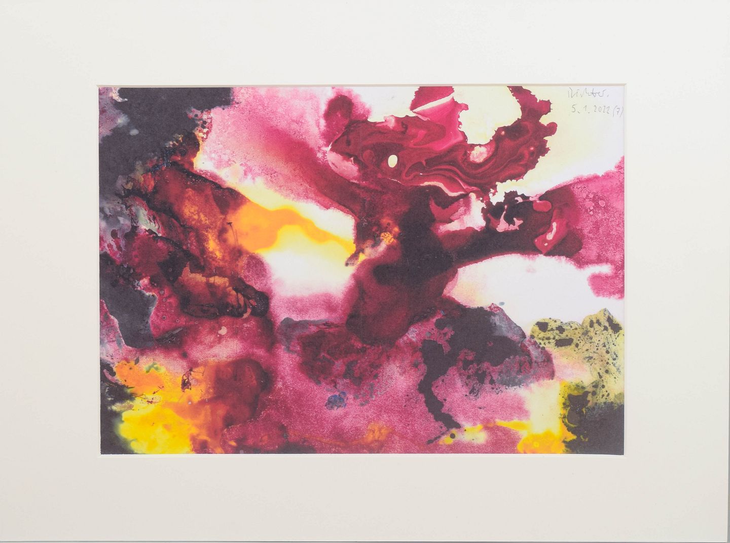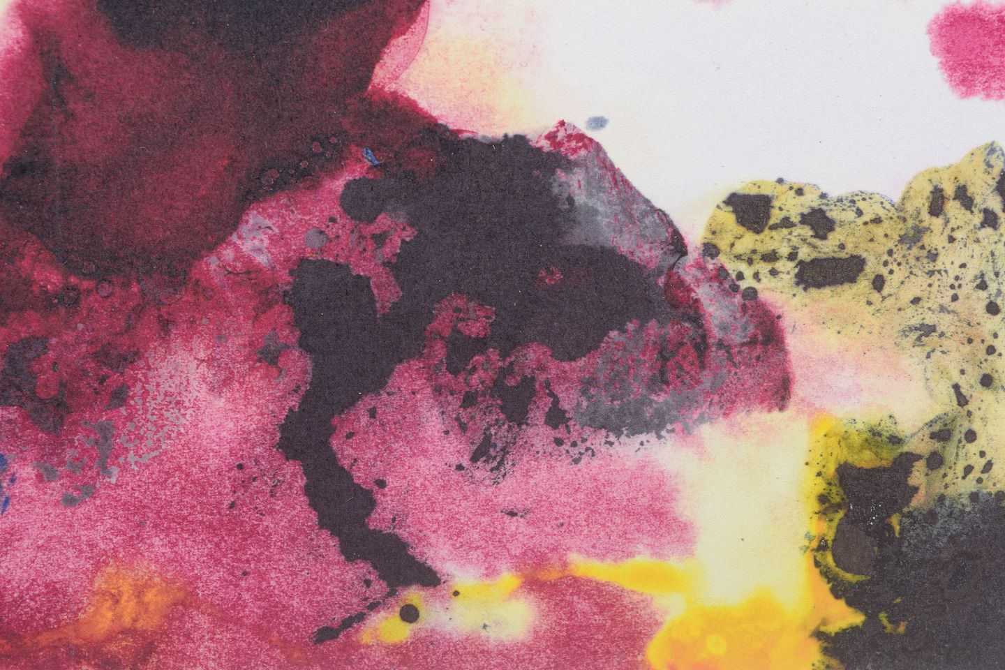 Abstract composition executed as a colour print with powerful colour fields in red, pink, yellow and dark tones. The motif appears dynamic and organic with fluid transitions and translucent layers, creating an intense and expressive visual character.