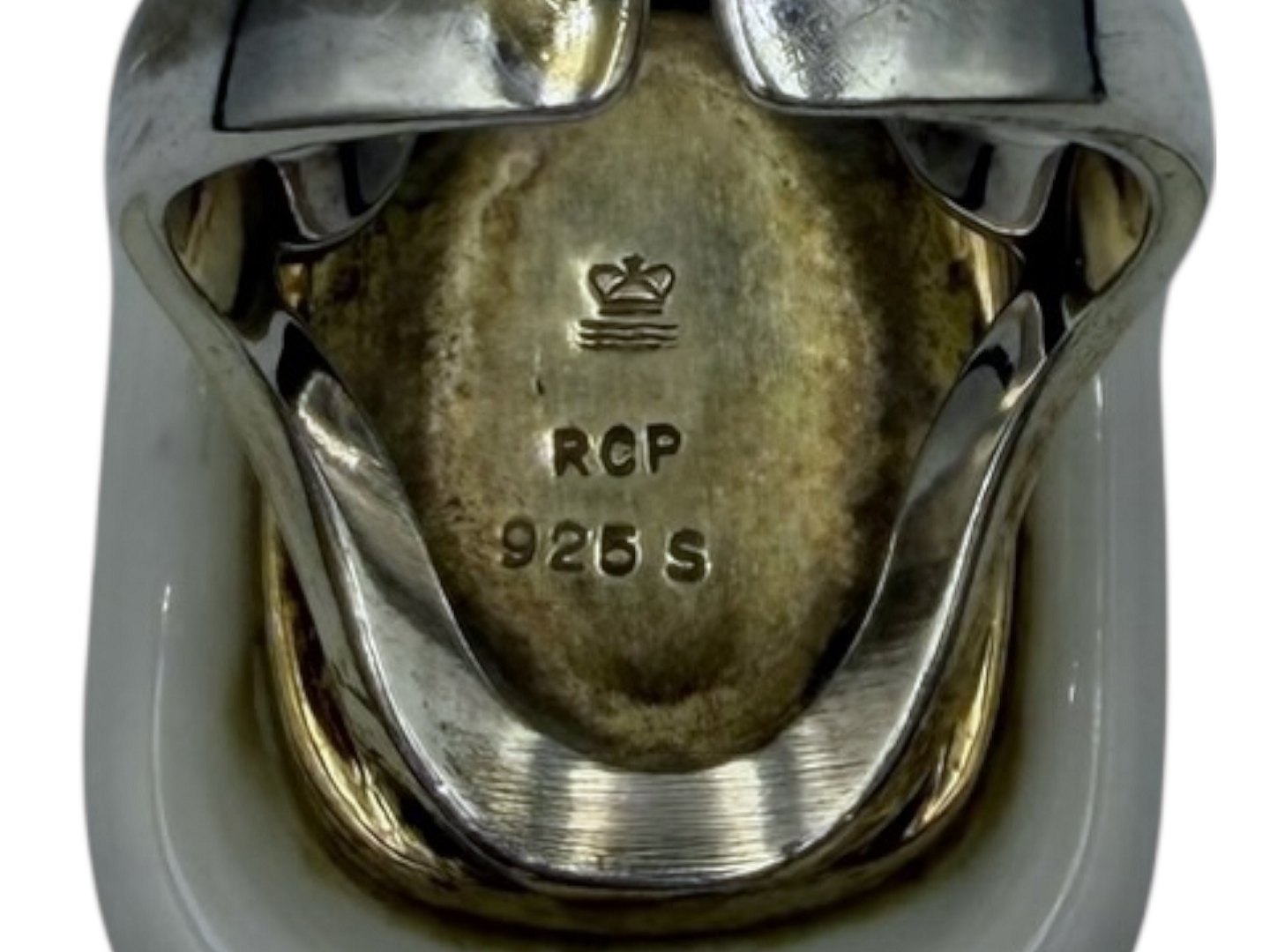 Royal Copenhagen sterling silver ring with modern porcelain on top.Ring size is variable. The top measures 3.0 by 2.1 cm.